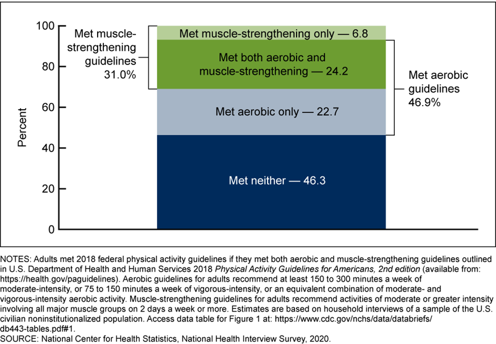 Despite public health messaging extolling the health benefits of physical activity, the majority of the U.S. population is inactive. In 2020, only 24% of adults met both aerobic and muscle strengthening guidelines whereas 46% did not meet either guideline (Elgaddal et al., 2022). Among physically active people, more are likely to meet the aerobic (47%) than muscle strengthening (31%) guidelines. The percentage of adults meeting both physical activity guidelines (Figure 2) decreases with age and is lower in women than men, in Hispanic men compared to Non-Hispanic White and Black men, in Hispanic, Non-Hispanic Black, and Non-Hispanic Asian women compared to Non-Hispanic White women, and persons with the lowest income (Elgaddal et al., 2022).