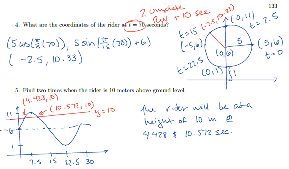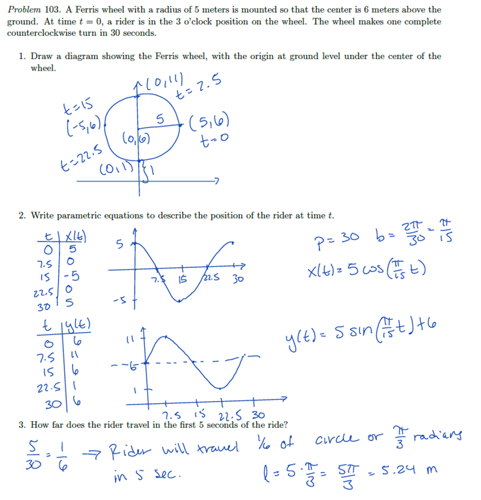 We will then move on to trigonometric modeling. Students will use the three reads protocol to create a diagram with the important information labeled. After the diagram has been created, students will be reminded of how we create parametric equations for linear functions, a process which they will need to extend to trigonometric parametric equations.
