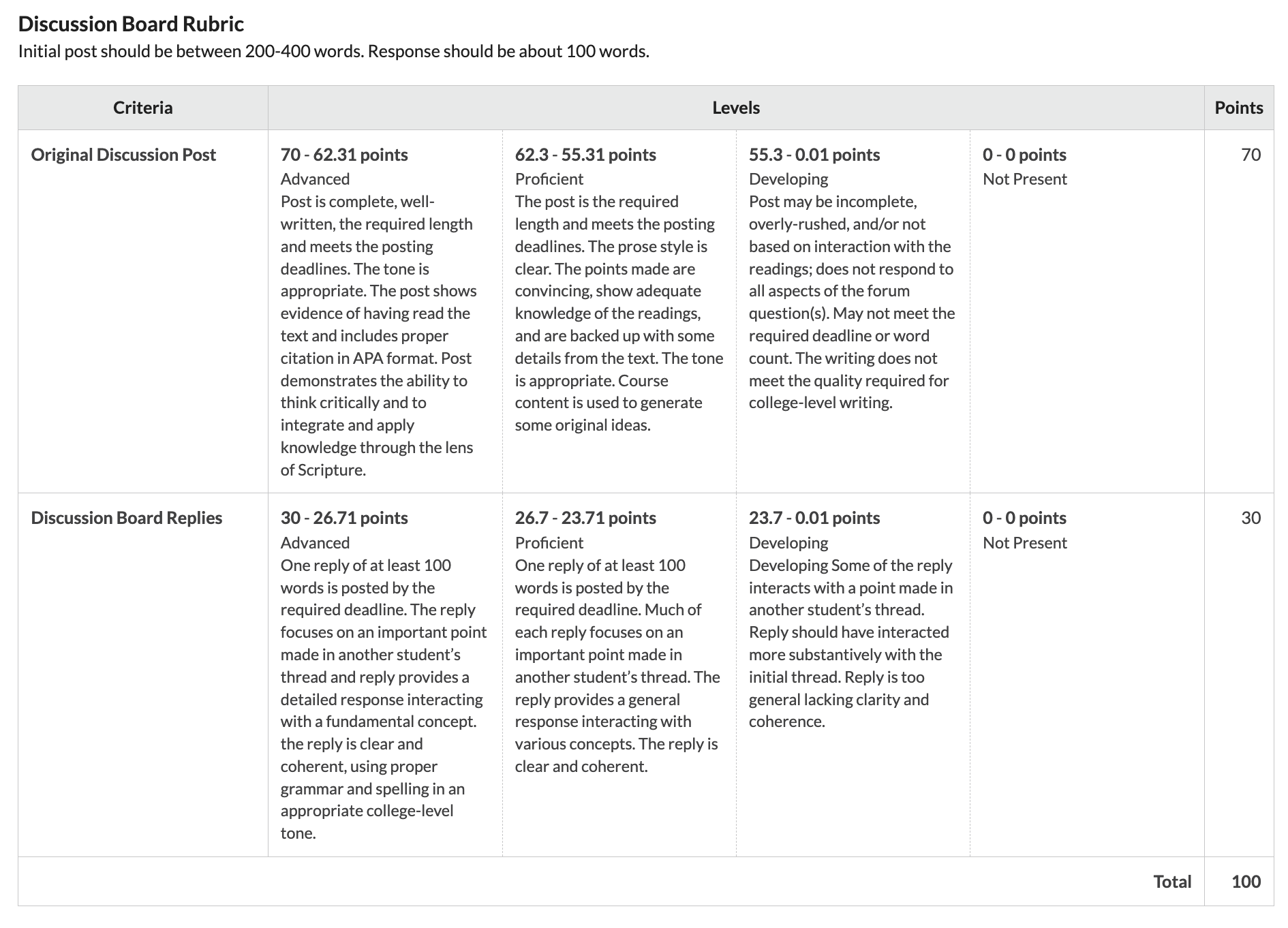 - Discussion 1: After reading one of the biblical classes and viewing the lecture, post an original thread by Thursday evening and two replies to peers by Sunday.