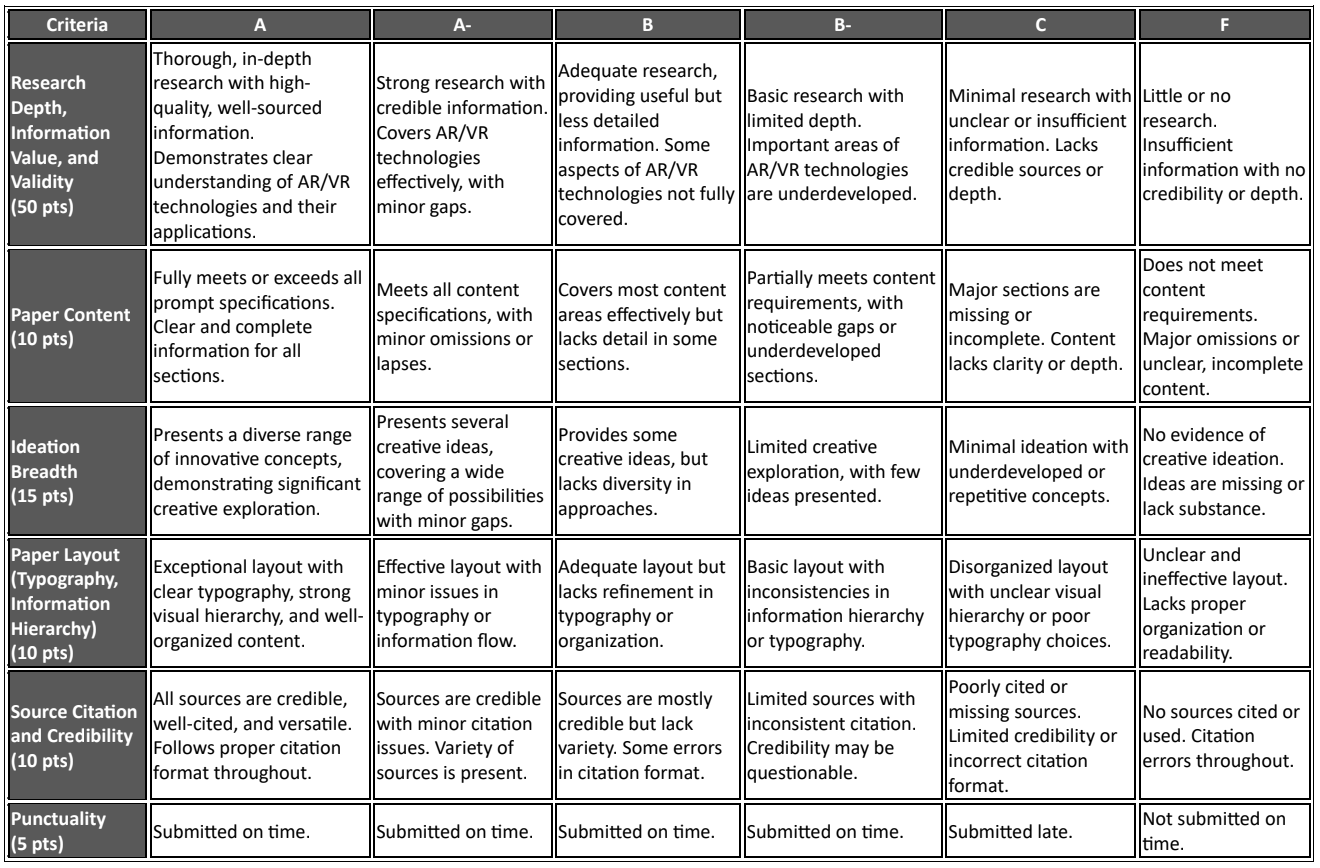 The assignment supports metacognitive awareness, helping students actively think about their learning processes, strengths, and areas for growth. Students were encouraged to plan, monitor, and evaluate their understanding and application of knowledge by working in teams to implement, evaluate, and present their creative concepts and engage in critiques.