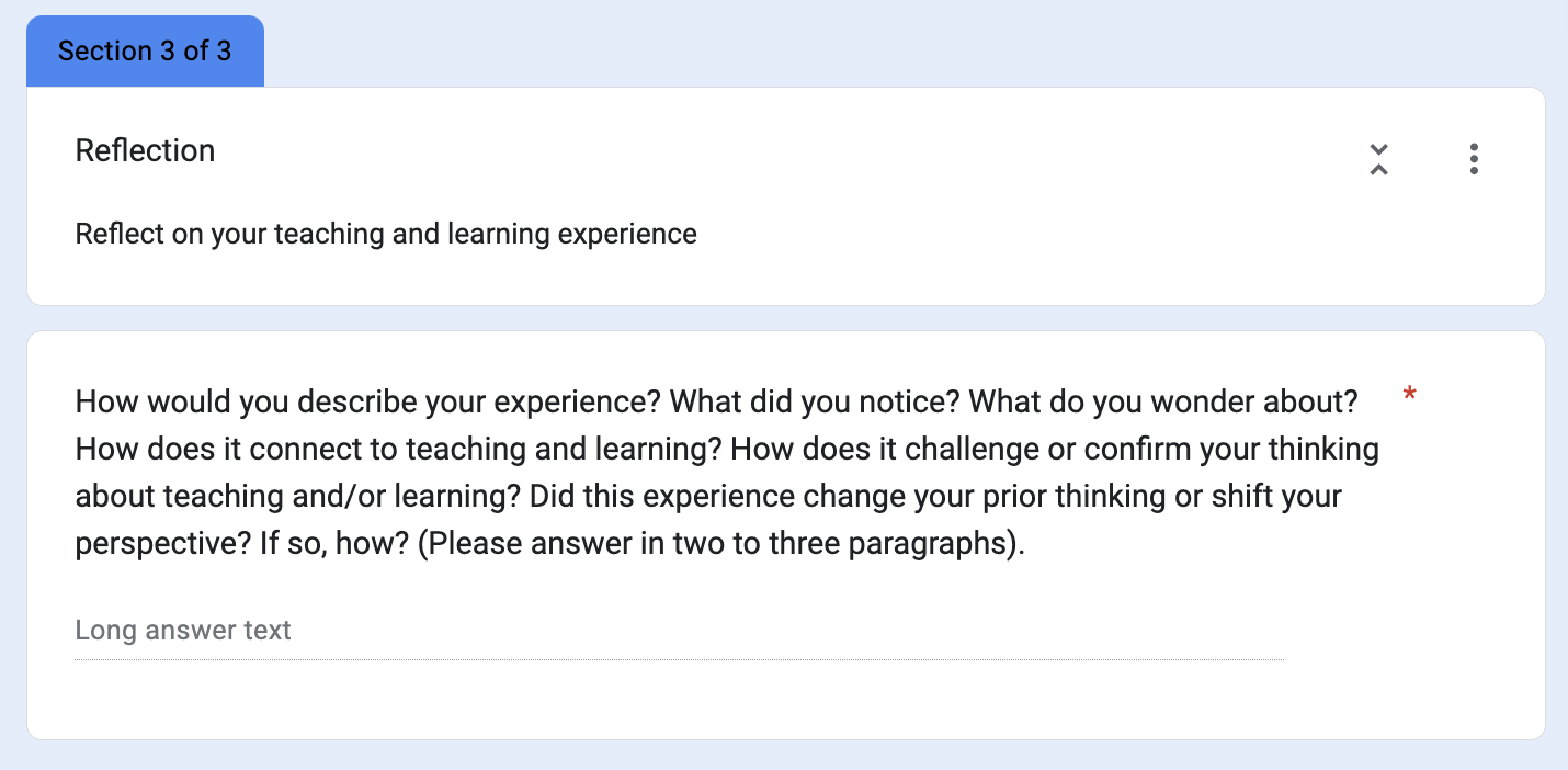 Students were asked to complete a reflection form after the workshop, including reflections on this activity. A screenshot of the reflection form is included below.