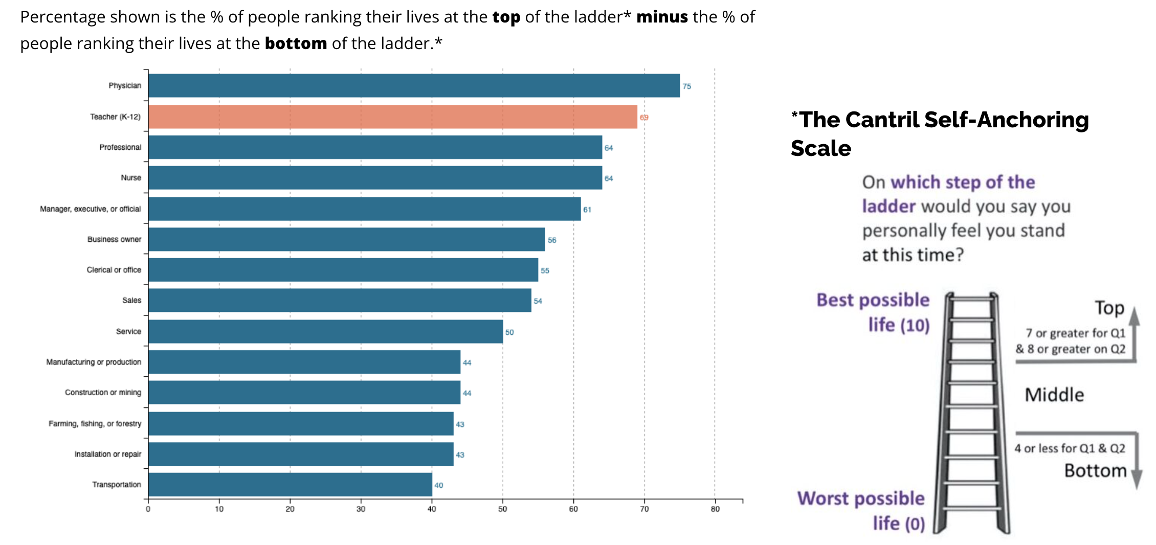 The goal of the Get the Facts Out initiative is to recruit students into teaching mathematics at the secondary (middle and high school) level. As part of this, the researchers have collected data to dispel or disprove some of the persistent myths and misconceptions surrounding teaching as a career. For example, the figure below was created from the Gallup-Healthways Well-Being Index survey with a random sample of 172,286 workers, aged 18 or over. Image Source: Get the Facts Out.