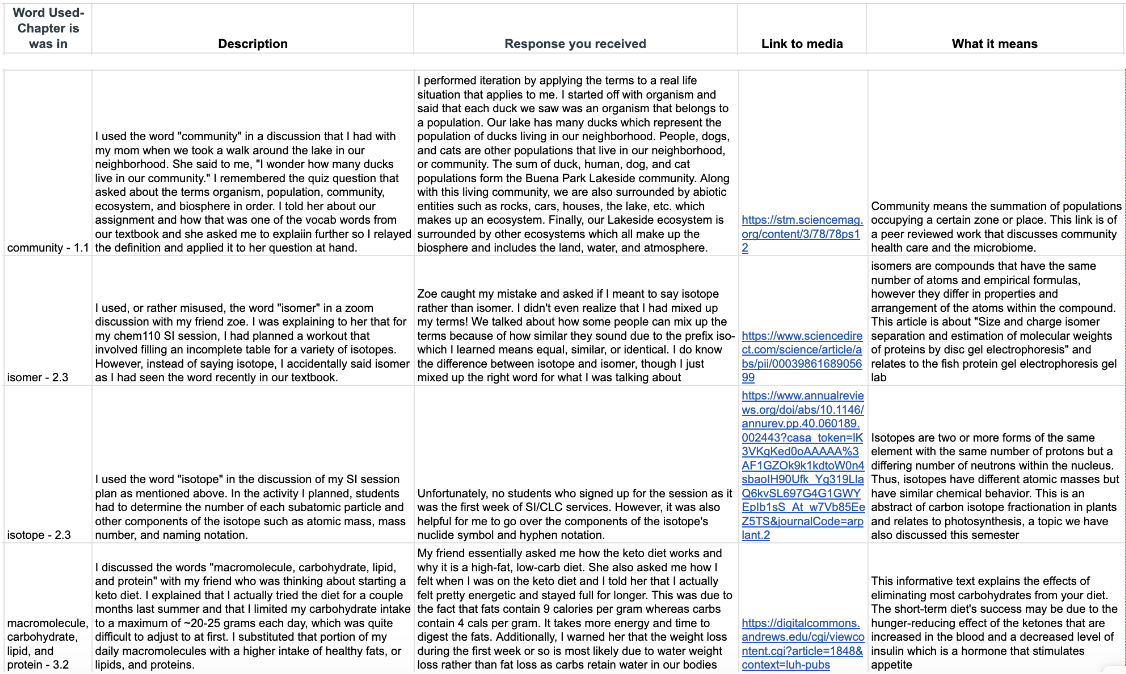 This course is the first semester of a two-semester core biology series. The course examines cell structure and function; cellular respiration and photosynthesis; cell signaling and reproduction; transmission and molecular genetics, transcription and translation; control of gene expression; biotechnology; comparative animal form and function; and animal development. Weekly during the semester, students identify a term from class lecture or discussion. They use that term in a conversation with someone outside of class. It could be a family member or a friend or even a stranger. Then, the student summarizes the conversation in a metacognitive journal entry (see examples below), detailing the word, the chapter it was from, a description of the conversation, the response from the person they were talking with, a link to media using the term, and what the term means to them.