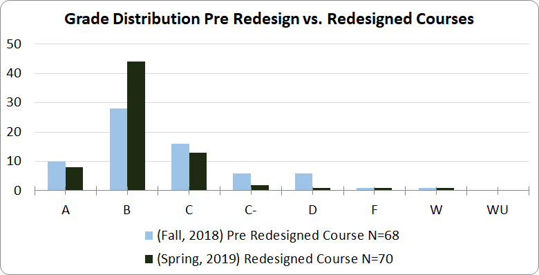 • Grade distribution for a sample pre-redesigned and redesigned course are shown below for the total count of students. We note that the number of students is similar (68 pre-redesign and 70 redesign) so the data looks very similar to a comparison of percentages.