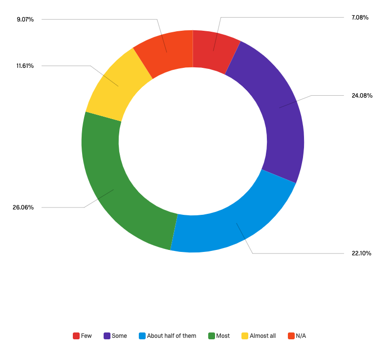 - 38% of the student respondents estimate that "most" or "almost all" CSUSB faculty are well trained in online teaching, and about 22% of the respondents estimate that about half of the CSUSB faculty are well trained in online teaching.