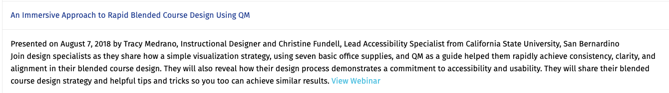 On August 7, 2018, instructional designer Tracy Medrano and accessibility specialist Christine Fundell presented the webinar "An Immersive Approach to Rapid Blended Course Design Using QM" as part of the Quality Matters Success Stories. The webinar had 198 participants.