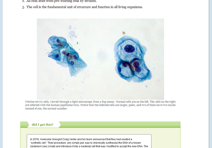 The OLI Biology is a native online resource that includes interactive content on almost every page. These active learning strategies are helpful for students who may be struggling with the material or students who do not learn best by reading text. My only concern was that some students may prefer to have a paper textbook (those that learn best by reading or those that prefer not to be on the computer as much). This particular OER is not one that can be printed, so I gave the students an option. They could either purchase the traditional publisher textbook or they could use the online OER.