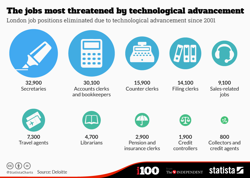 Reference: https://www.statista.com/chart/3262/the-jobs-most-threatened-by-technological-advancement/