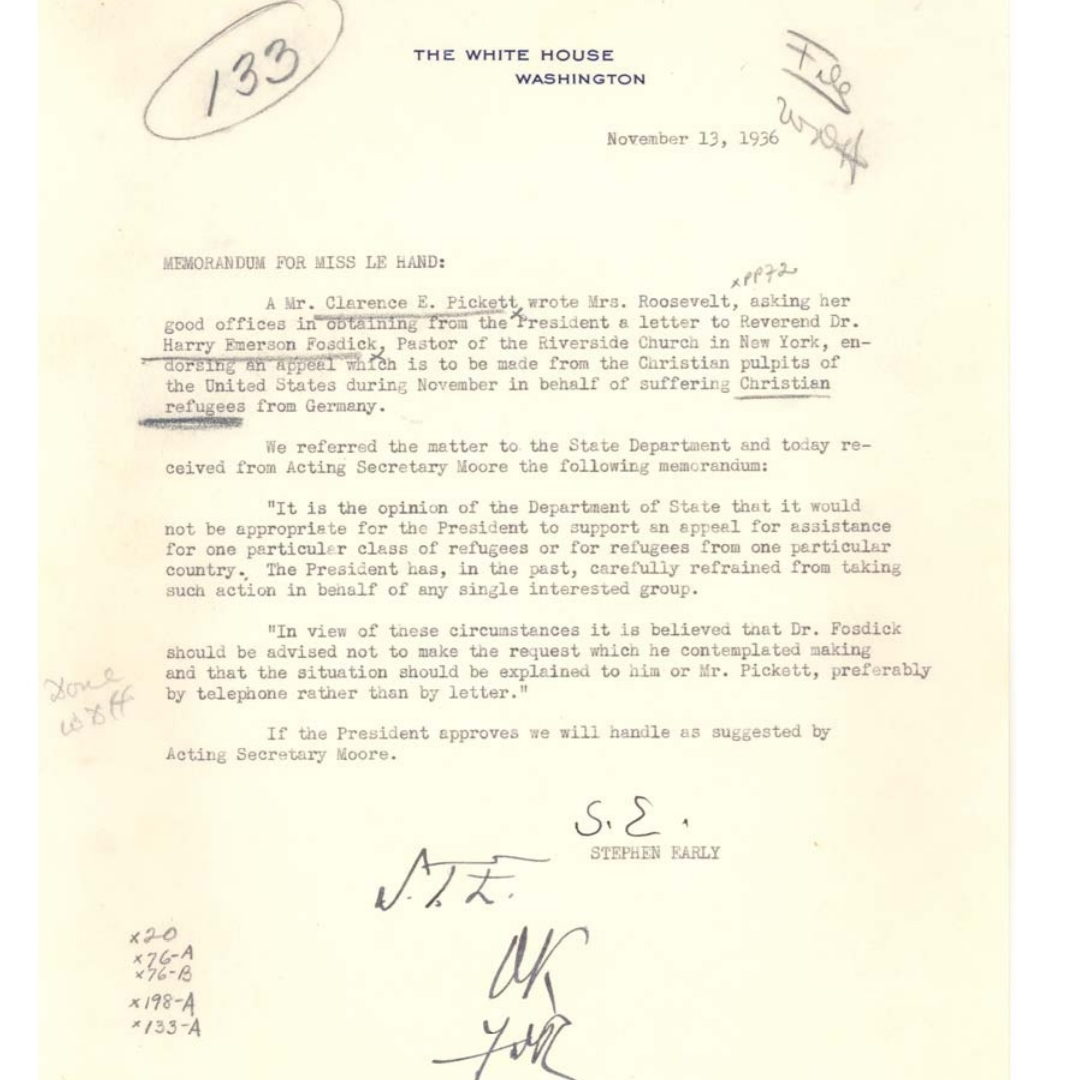 "Memorandum for Miss LeHand from Stephen Early, November 13, 1936: Because of the country’s isolationism and the immigration laws in place in the mid-1930s, President Roosevelt often felt constrained in taking a more proactive stance with regard to European refugees. In this November 13, 1936 memorandum for the President’s private secretary Missy LeHand, Press Secretary Stephen Early recommends that the President resist the temptation to issue a requested appeal on behalf of persecuted Christians in Germany. Such an appeal, in the opinion of Early and the State Department, would be an inappropriate expression of the President’s preference for one group of refugees over others. The President indicates his acceptance of Early’s recommendation at the bottom of the memo. (President’s Official File 133: Immigration, 1936-1941, Box 1)." http://www.fdrlibrary.marist.edu/archives/pdfs/holocaust.pdf