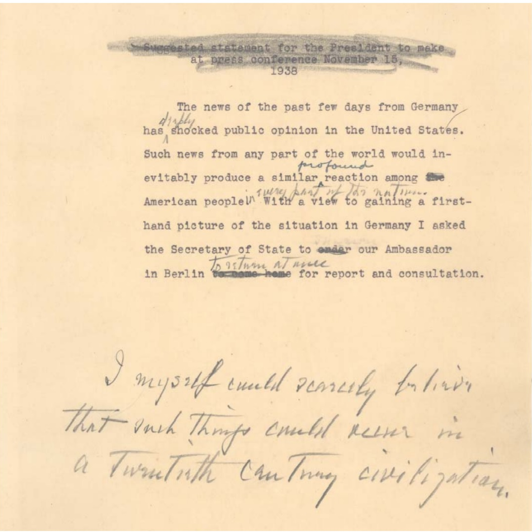 "Draft Statement by the President, November 15, 1938: When the reports of the Nazi violence were confirmed, the President drafted this statement expressing his outrage at Kristallnacht and recalling the American ambassador to Germany. The changes and additions are in the President’s own hand, and the final message was approved by Secretary of State Cordell Hull who placed his initials in the lower right hand corner. The President read the statement at his press conference held on November 15, 1938. (President’s Secretary’s Files; Diplomatic Correspondence; Germany, 1933-1938, Box 31)." http://www.fdrlibrary.marist.edu/archives/pdfs/holocaust.pdf