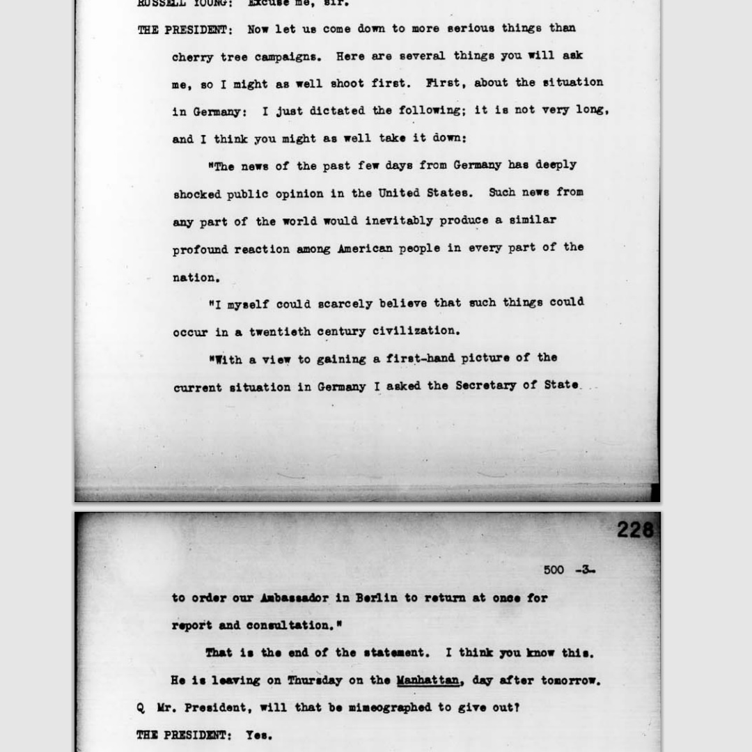 Transcripts from: Press Conference 500, November 15, 1938, and Conference 501 November 18 1938, provided by FDR Presidential Library & Museum. The transcripts shows FDR recognizing the tragedies that happened during Kristallnacht, and he also stays firm in following the quota system when asked about increasing immigration for U.S. Then in a few days, he announced an extension on visitors passports for refugees that were in America.