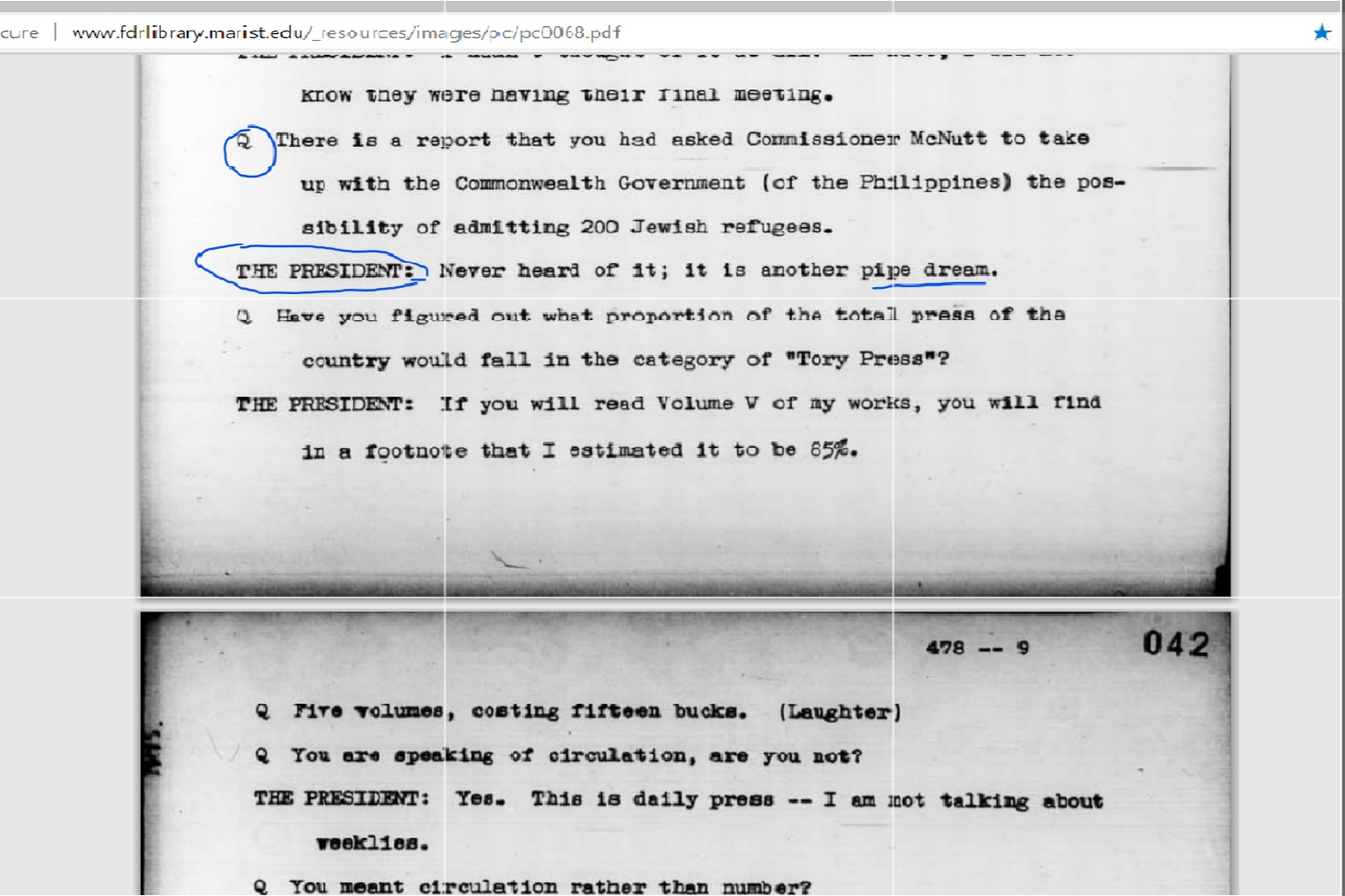 "Never heard of it; it is another pipe dream." *Image from archives of transcripts of FDR's press conferences from fdrlibrary.marist.edu