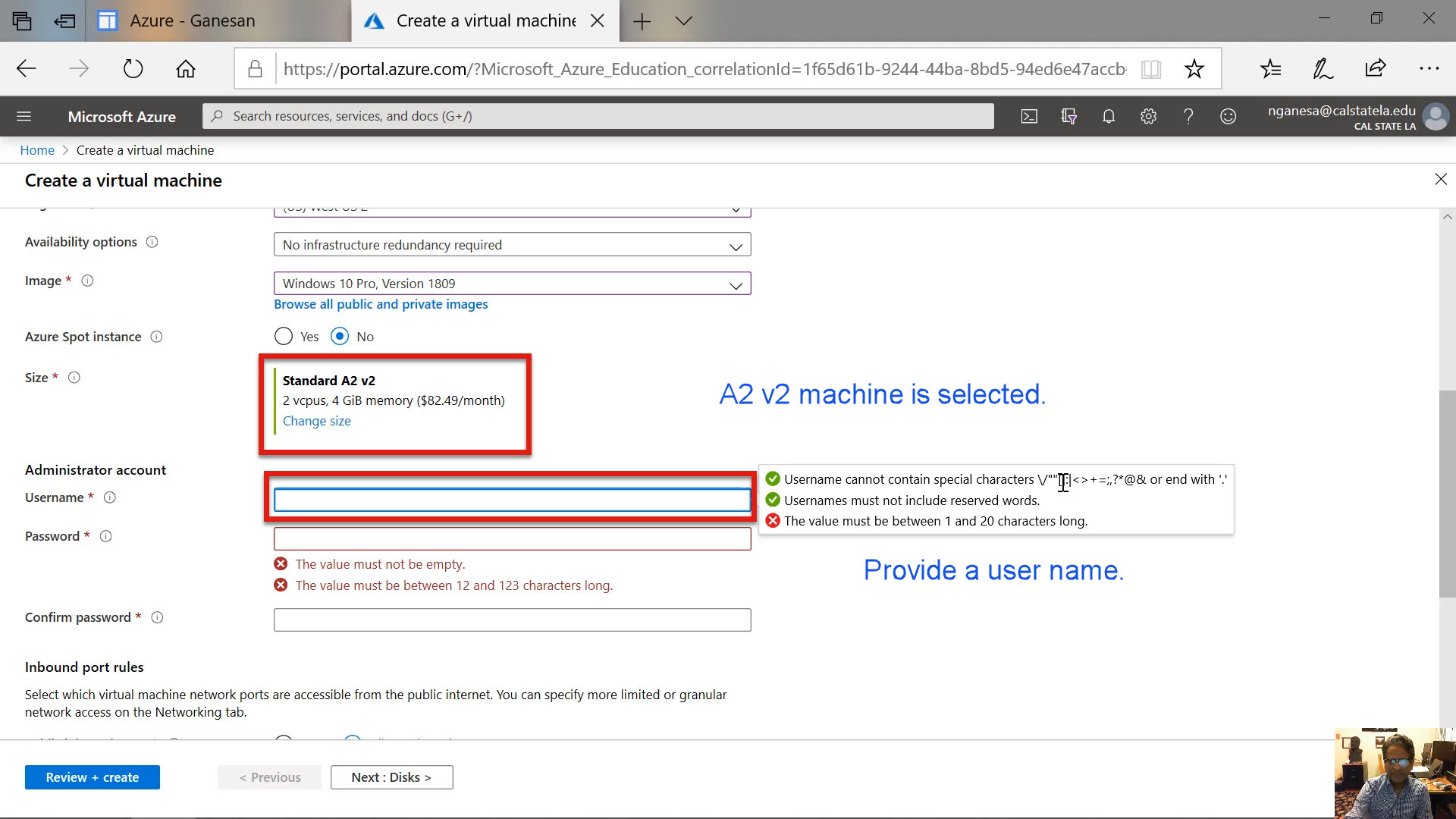The next step is to specify the administrator’s username and password. These are the credentials needed to first log into the virtual machine. As in similar instances, there are specific restrictions that apply to the username and the password. They are displayed in the previous diagram. It is essential to follow the guidelines to be able to specify an acceptable username and password. The masked username and password entries are shown in the next diagram.