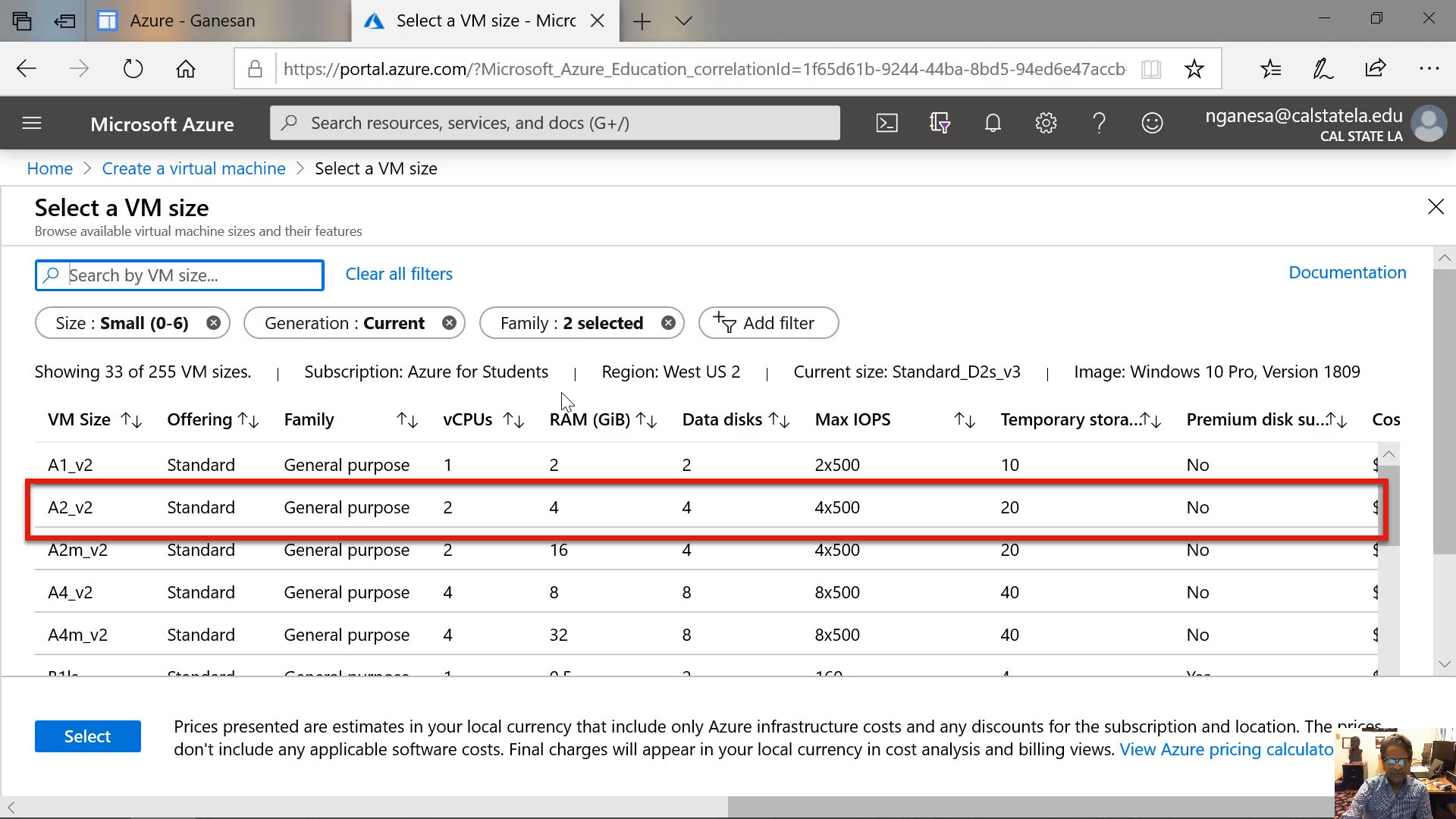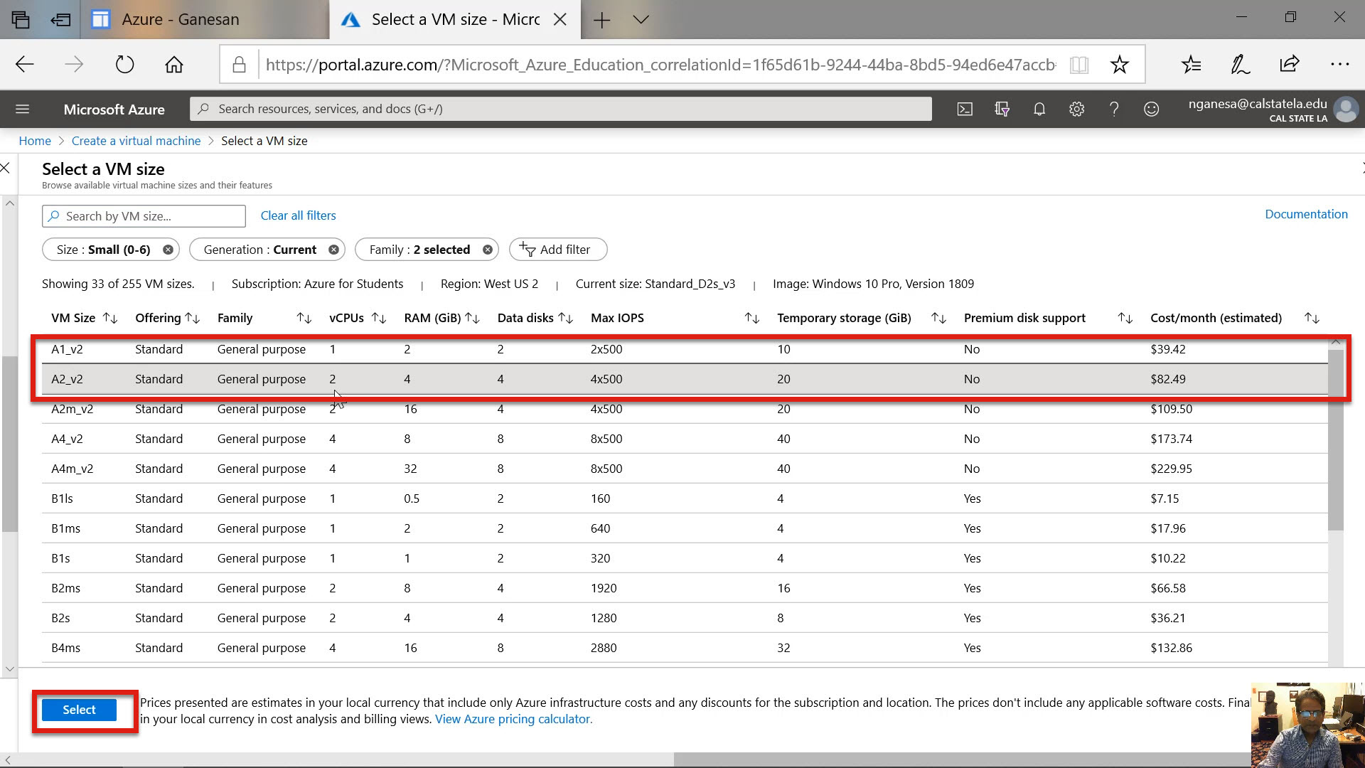 The next diagram shows the cost structure. As anticipated, higher-powered VM machines are more expensive. For example, the VM size labeled A2MV2 will cost higher to use compared to the VM size labelled A2V2. It is because A2MV2 has more memory than A2V2. For this lab exercise, the A2V2 machine is sufficient to run the required programs. Therefore, select the A2V2 virtual machine configuration.