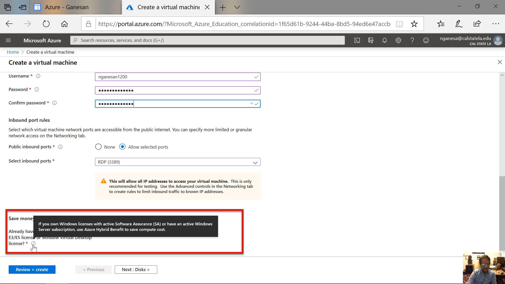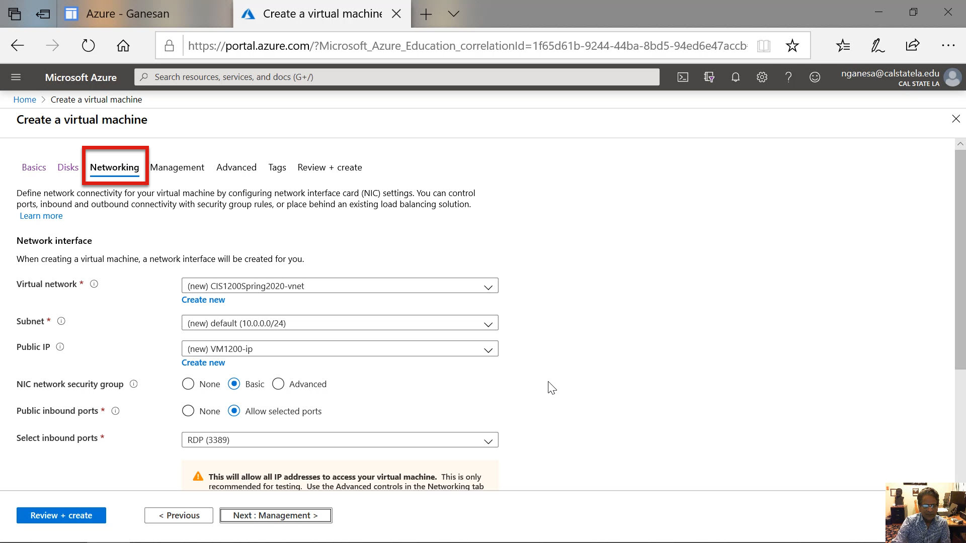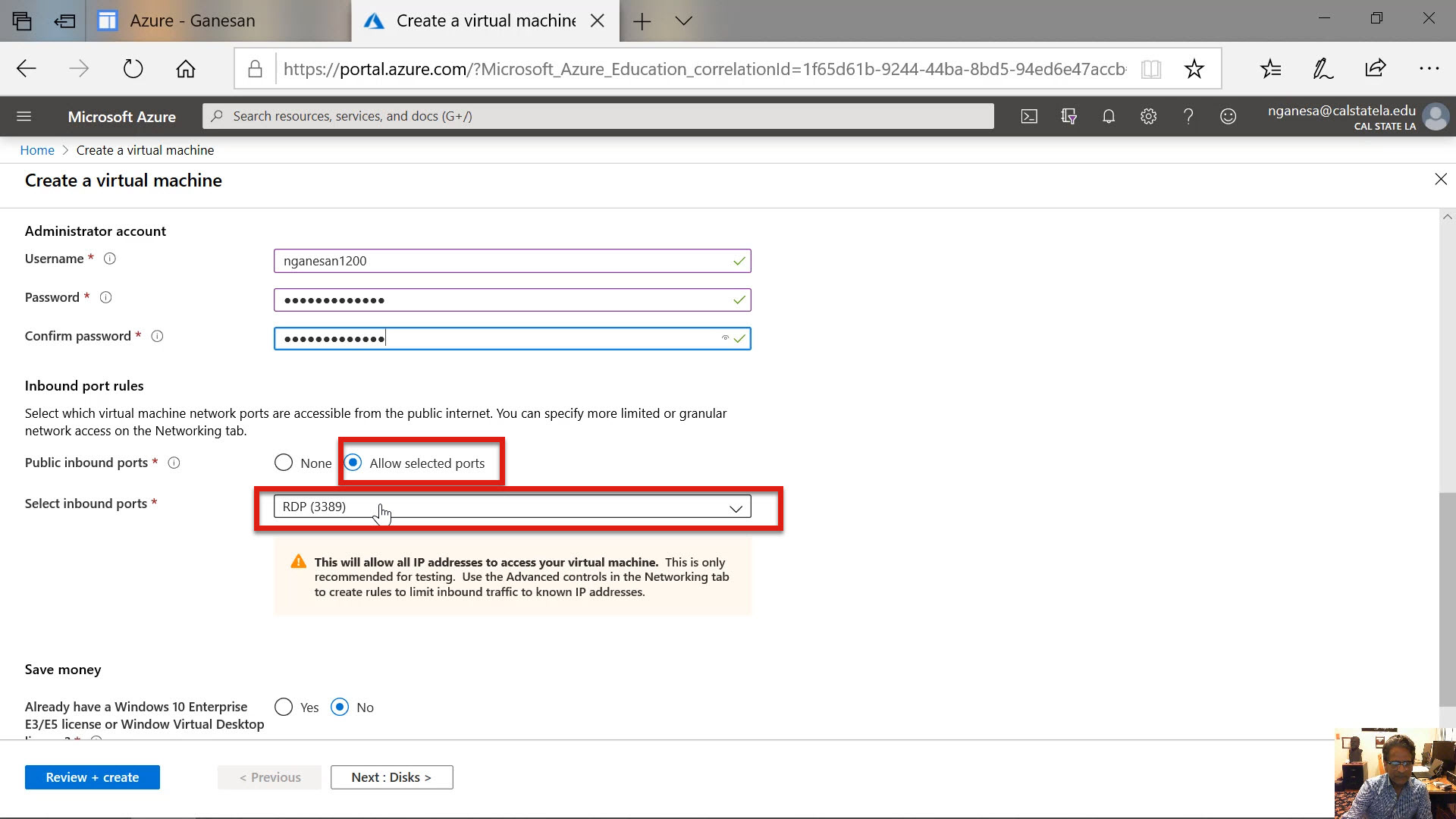 The next step is to facilitate access through the firewall to some of the ports. One of the ports is already designated to allow access to the computer for communications involving the RDP protocol. The associated port number, in this case, is 3389. The port would allow the virtual machine to be accessed and configured, as needed, using the Remote Desktop app. It is, therefore, necessary to leave the selection intact. Again, a warning message is displayed indicating that access through this port should be limited to only testing the VM. In another tutorial, the proper way to access the virtual machine, other than accessing it through the port 3389 using the Remote Desktop app, is discussed.