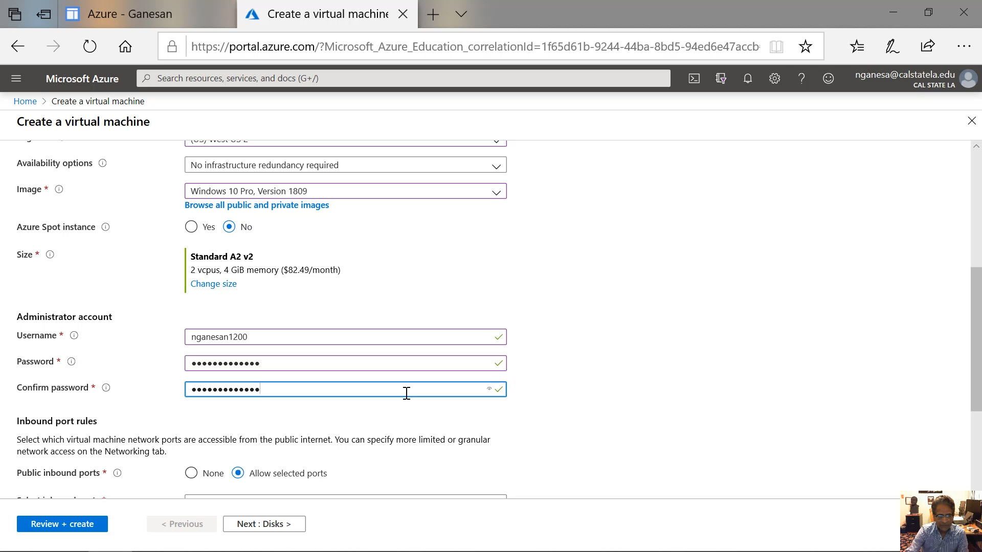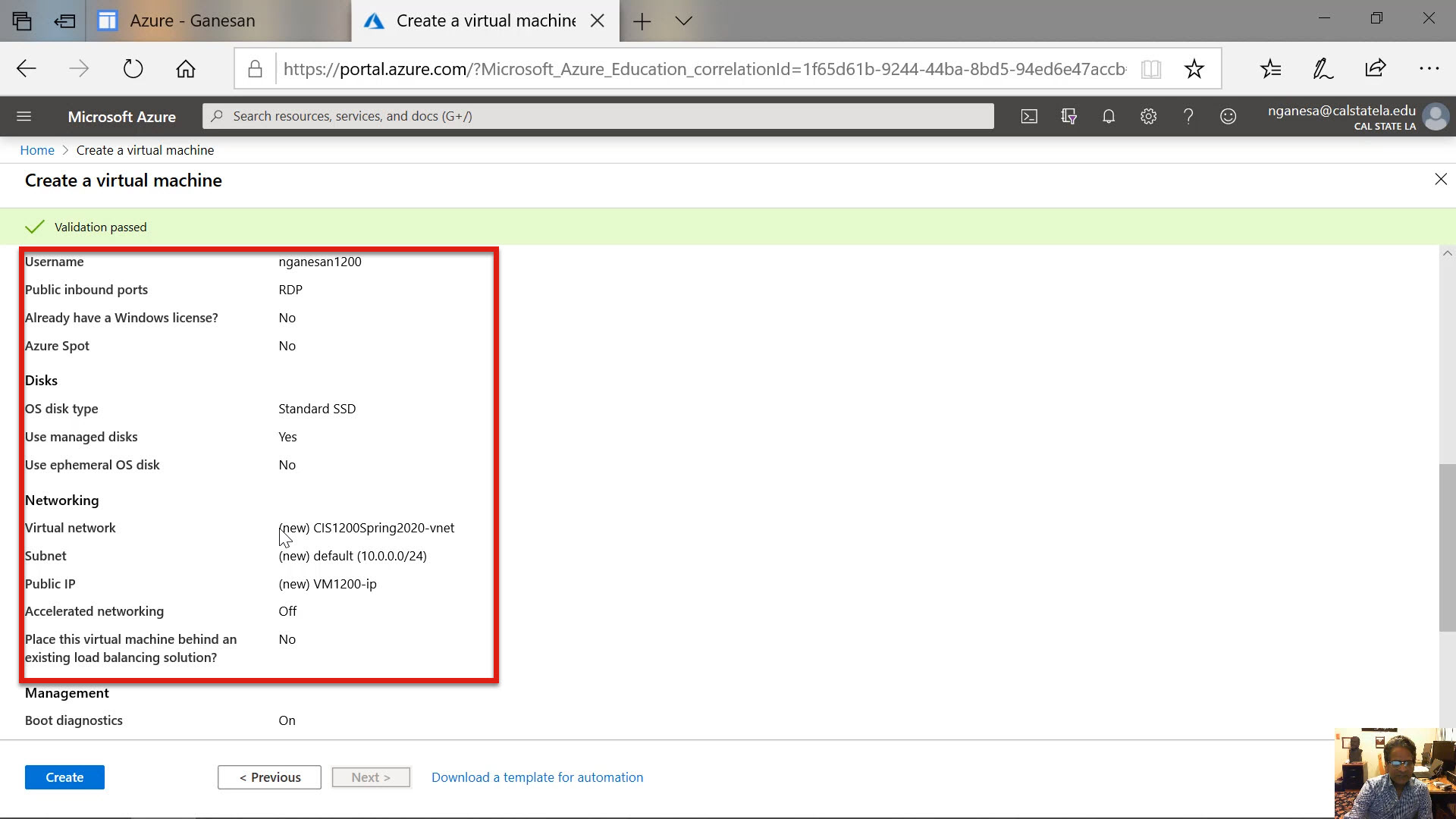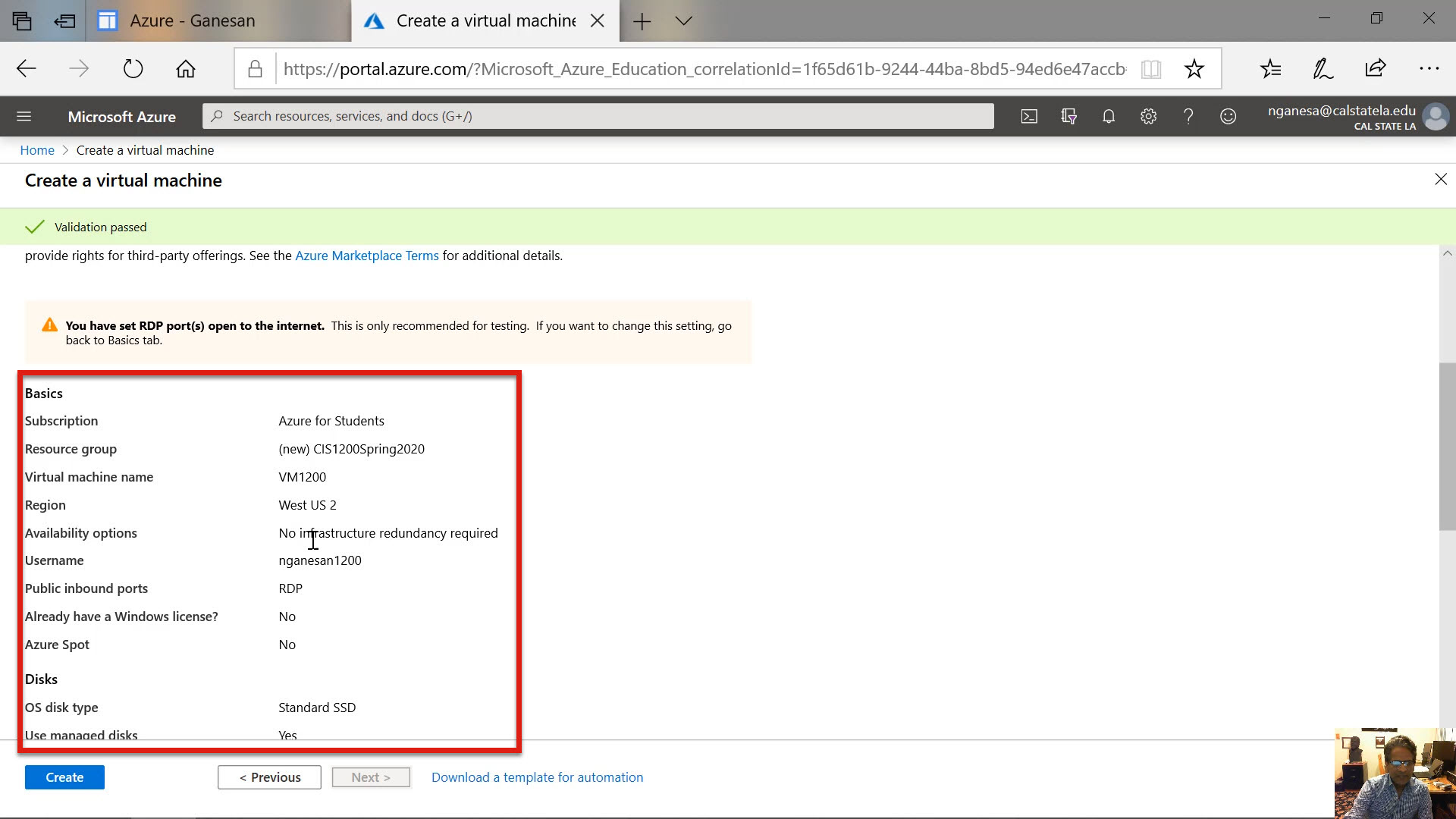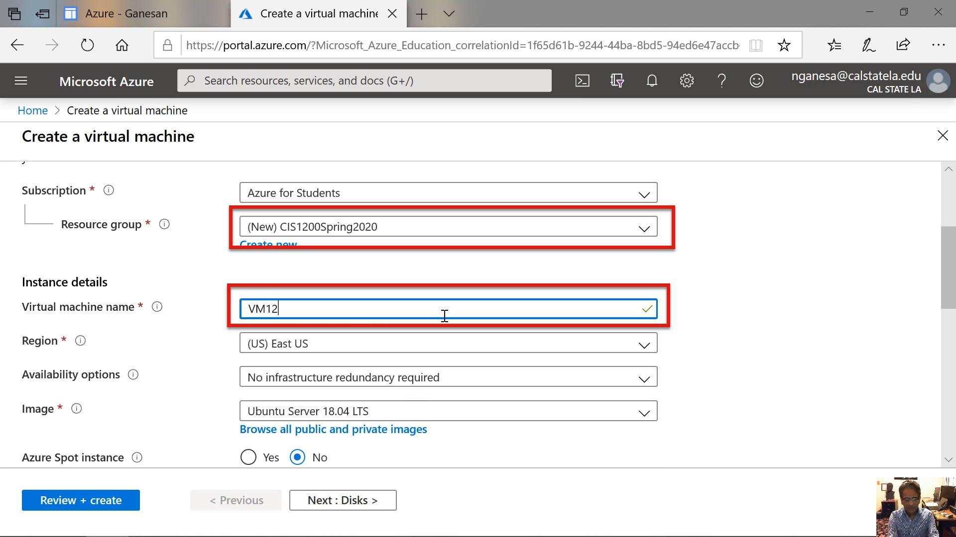 The next step is to select a resource group. Since this is the first time a virtual machine is being created, there will be no resource groups already defined. In this case, define a new resource group. It is also possible to choose a resource group from the dropdown menu provided the group has already been created. The resource group is where all the resources that are defined and used for running the virtual machine is grouped. For this example, the resource group CIS1200Spring 2020 is created. Incidentally, a new resource group is created by selecting the option entitled Create New that appears just below the box corresponding to the resource group.
