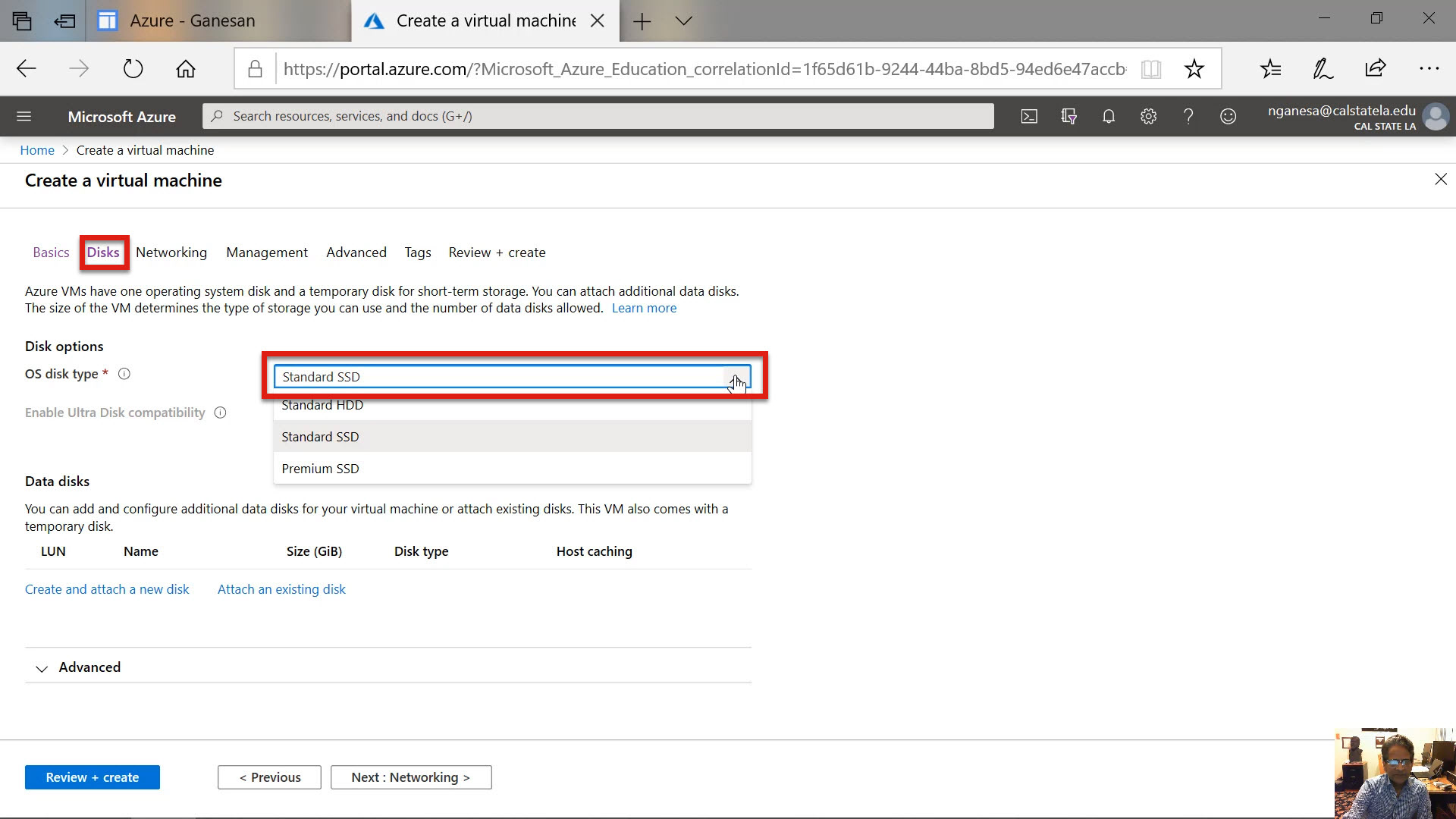 The next step is to select and attach a disk storage by first clicking on the Next Disks button. There are different types of disks available for selection. They include the standard HDD and the SSD disks. A premium version of SSD is also available. In general, the SSD disks provide better fault tolerance. Therefore, select the standard SSD disk as the storage device for the VM, as shown in the next diagram.