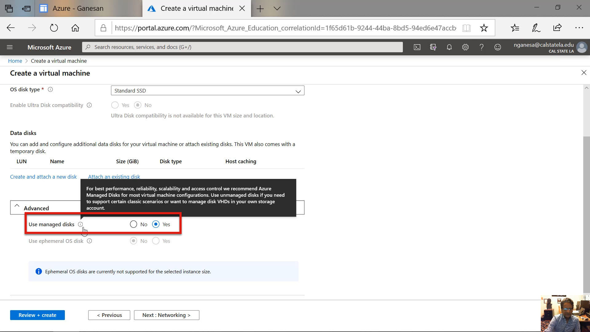 Once the disk is chosen, the next step is to state whether the disk is to be managed or not managed. Select the Use Managed Disks option because it provides better performance, reliability, and scalability.