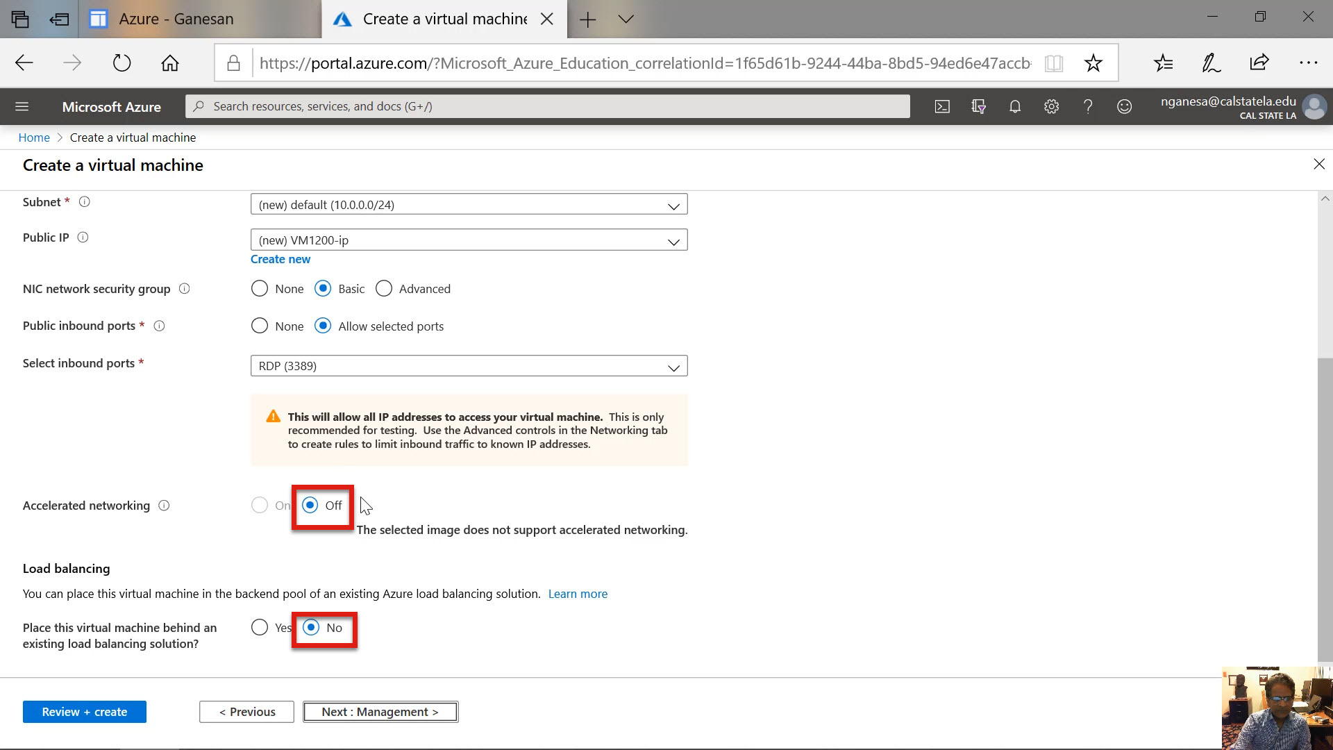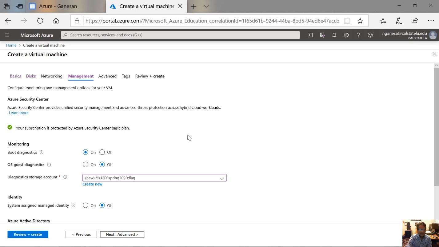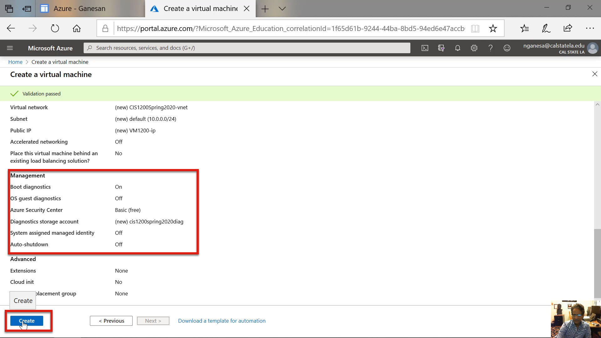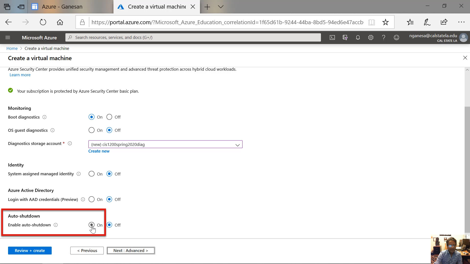 The next step is to specify the management attributes for the virtual machine. Here again, most of the pre-selected values are acceptable except for the default setting of the auto-shutdown option. By default, the auto-shutdown option is turned off. It needs to be turned on. The reason is to prevent the virtual machine from running unnecessarily incurring additional costs when it is not being used or utilized. In a subsequent tutorial, the proper way to start and stop a virtual machine will be discussed. It is important to manage the virtual machine by properly starting and stopping the machine in order to reduce the cost of using the machine. At this stage, therefore, click the button to turn on the auto-shutoff feature. The next two diagrams show the upper part and the lower part of the management screen indicating the selections in force for various options. The lower part of the management screen shows that the auto-shutdown feature is now turned on.