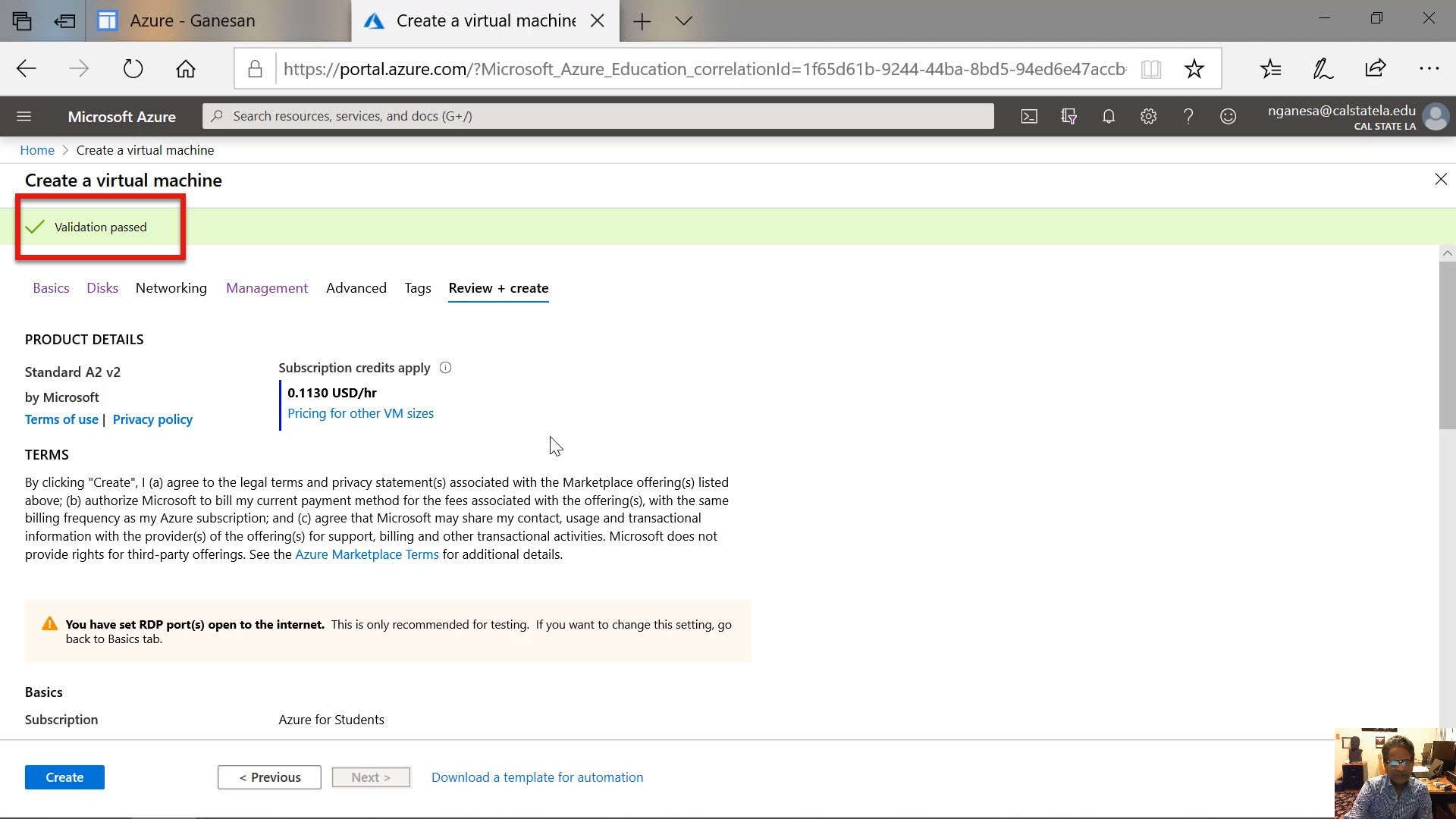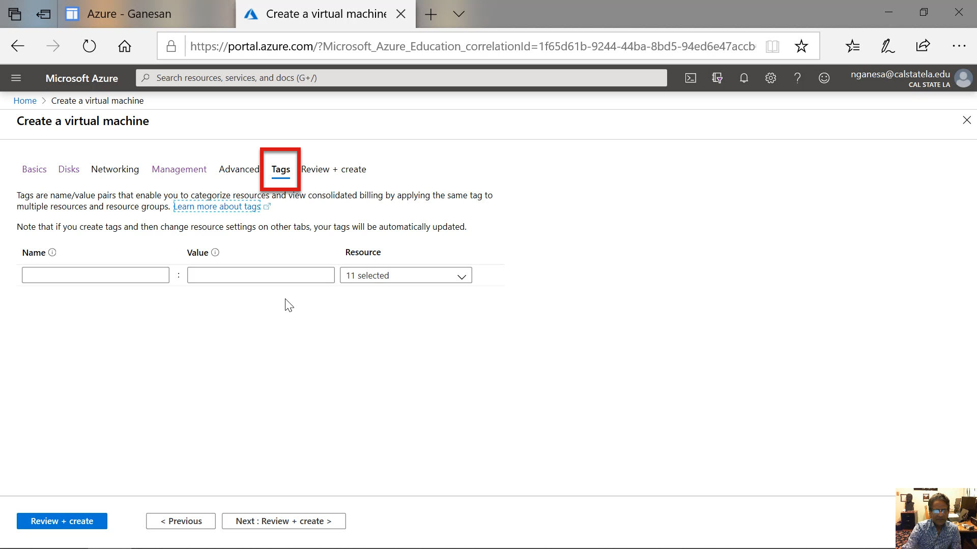 Now, click the next button shown in the previous diagram to move to the next step where, if needed, a tag can be assigned to the virtual machine. When there are numerous virtual machines and resources configured, it is sometimes easier to identify the machines or the resources by using tags. Since only one virtual machine is now being created, it is not necessary to assign a tag to the machine. Therefore, the button for reviewing and creating the machine can now be clicked. This would move the virtual machine creation process to its final stage. It might sometimes take some time for the next screen to display because Azure will now start validating all the selections that were made previously.