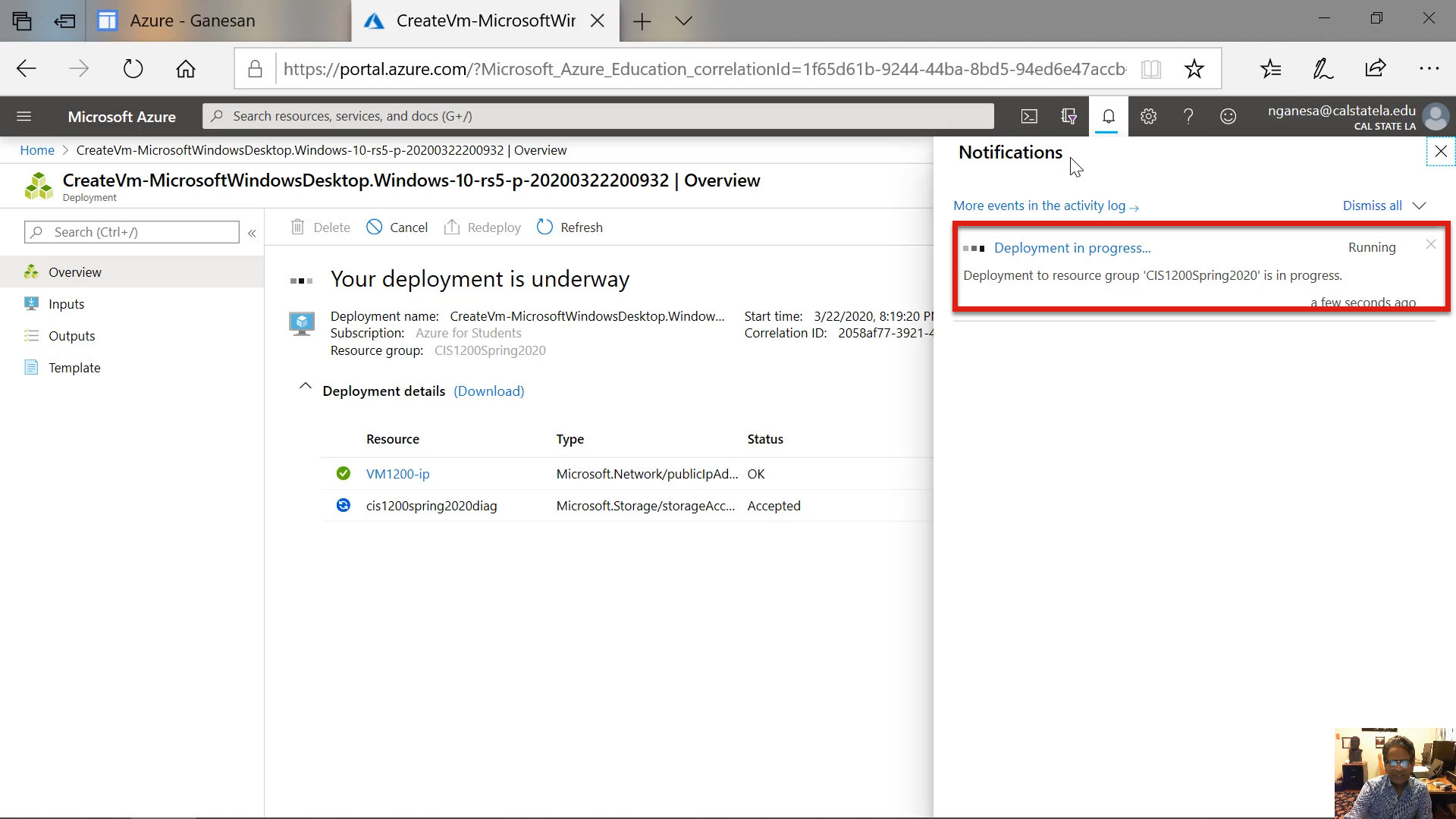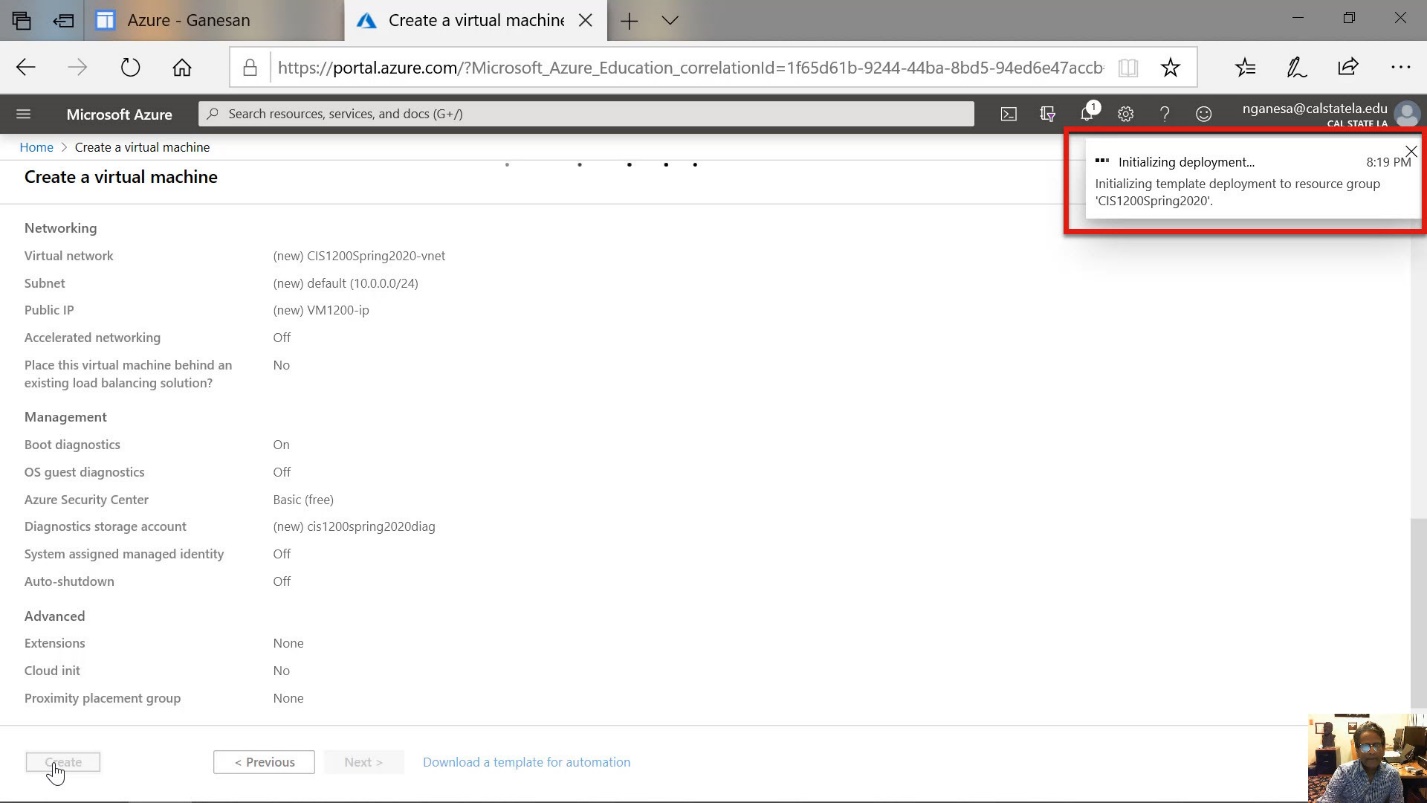 Once the selections are reviewed and confirmed, the next step would be to click the create button to initialize and deploy the VM. When the initialization process is complete, the resources needed to operate the virtual machine will be created along with the virtual machine itself. The next three diagrams show the initialization, the creation of resources, and the deployment of the VM. As the creation process progress, the relevant messages are displayed, one after another, on the top right-hand corner of the screen, as shown in the next three diagrams.