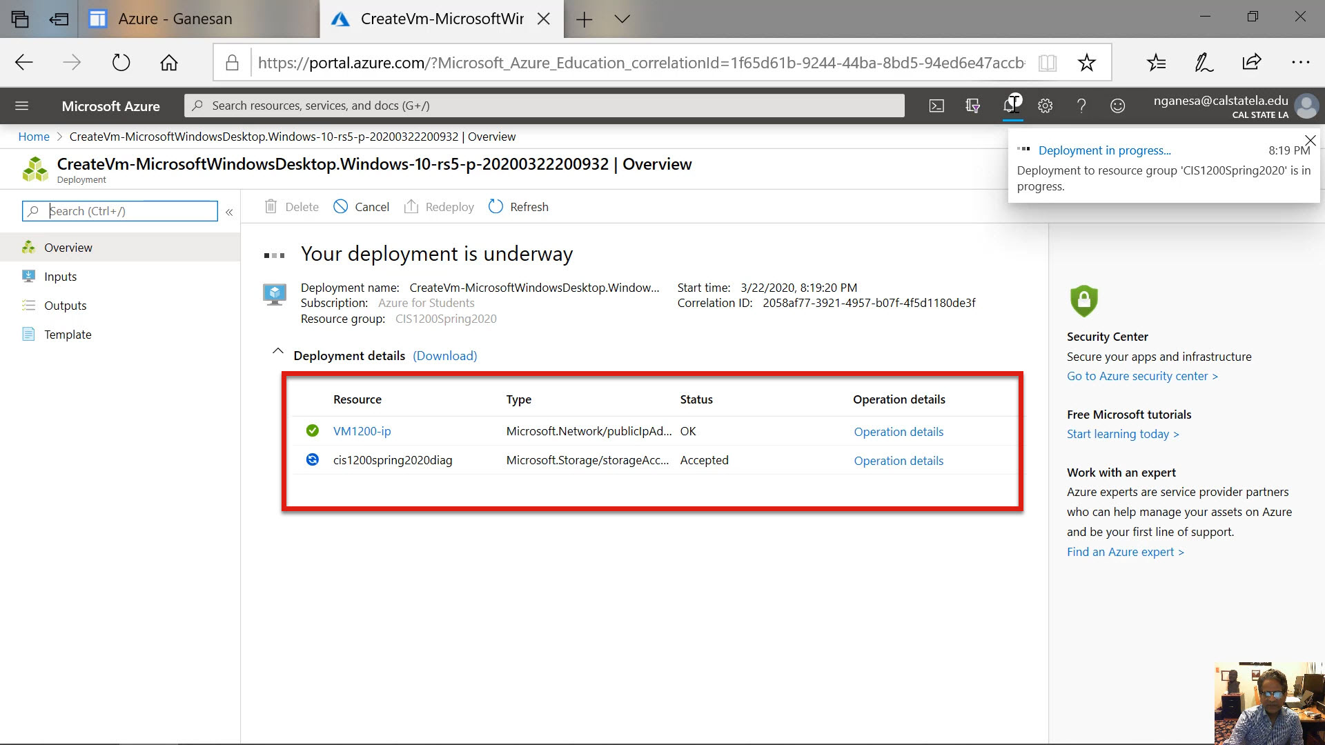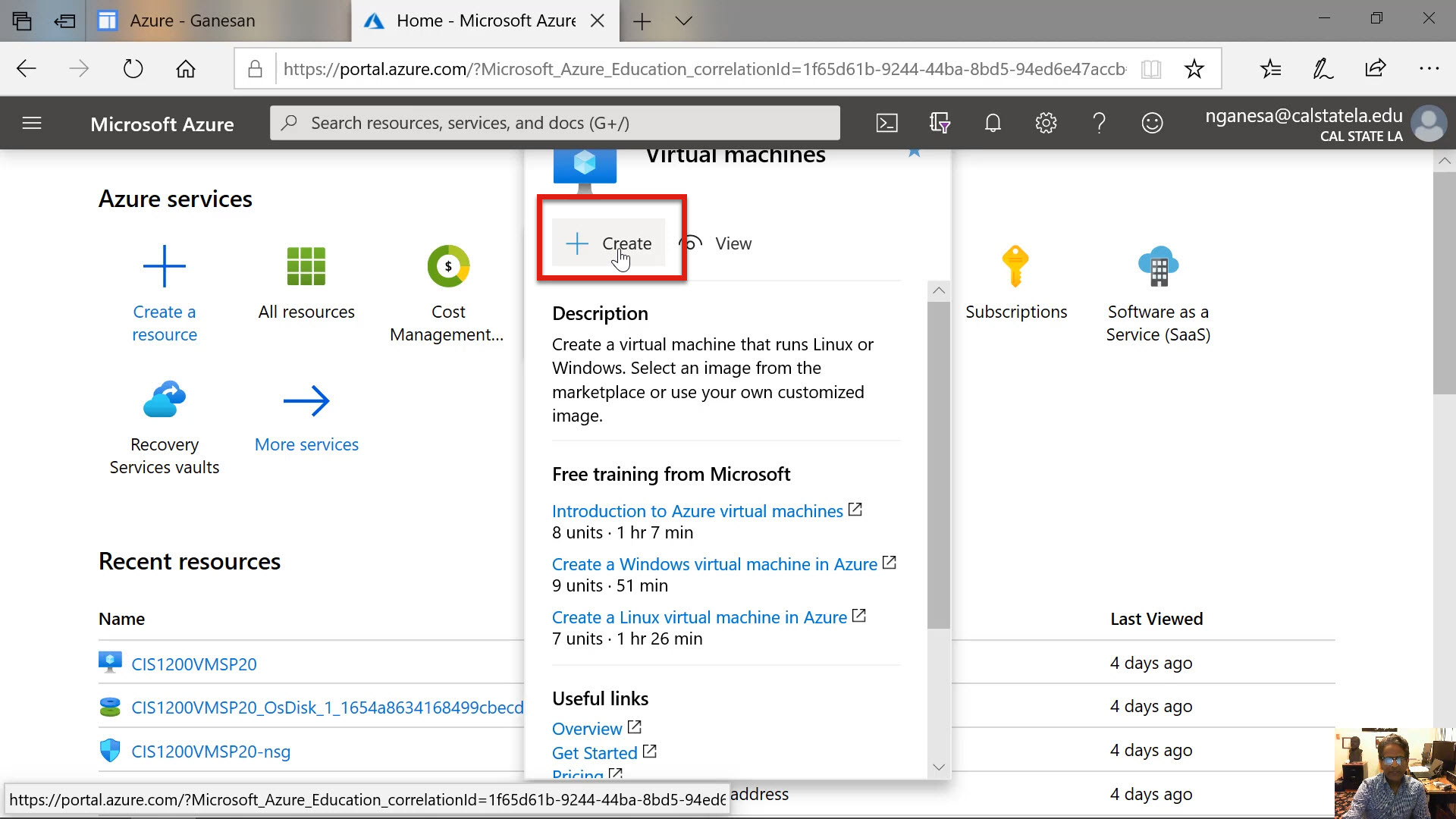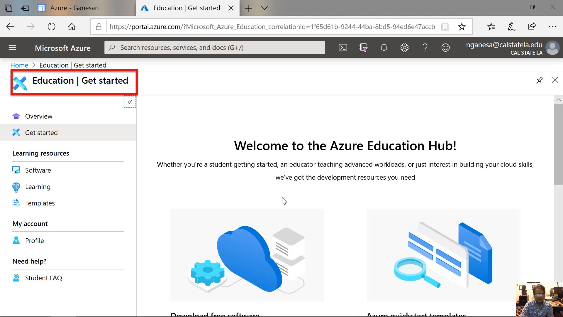 After signing into the portal, the initial welcome screen will be displayed as shown in the following diagram. If a student is logging into the portal for the first time, then a window in the middle may appear requiring the student to redeem the free $200 credit given by Azure before proceeding further. Before starting to use Azure, the students must redeem the credit by following the step-by-step instructions displayed on the screen.