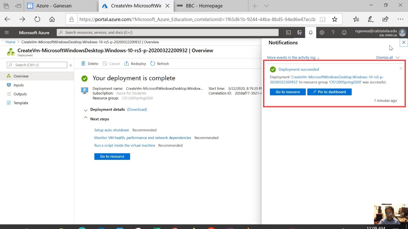 Once the virtual machine is deployed, the message stating that the virtual machine has been created and deployed is displayed. The next diagram shows the message indicating the successful creation of the virtual machine. At any time, these messages can be viewed by clicking on the bell icon located on the top banner entitled Microsoft Azure. When the message Successfully Deployed is displayed, the initialization, creation, and deployment of the virtual machine are completed. In this case, a Windows 10 Pro virtual machine has been successfully created for use as any other physical Windows 10 machine. In a subsequent tutorial, managing and using the virtual machine will be discussed.