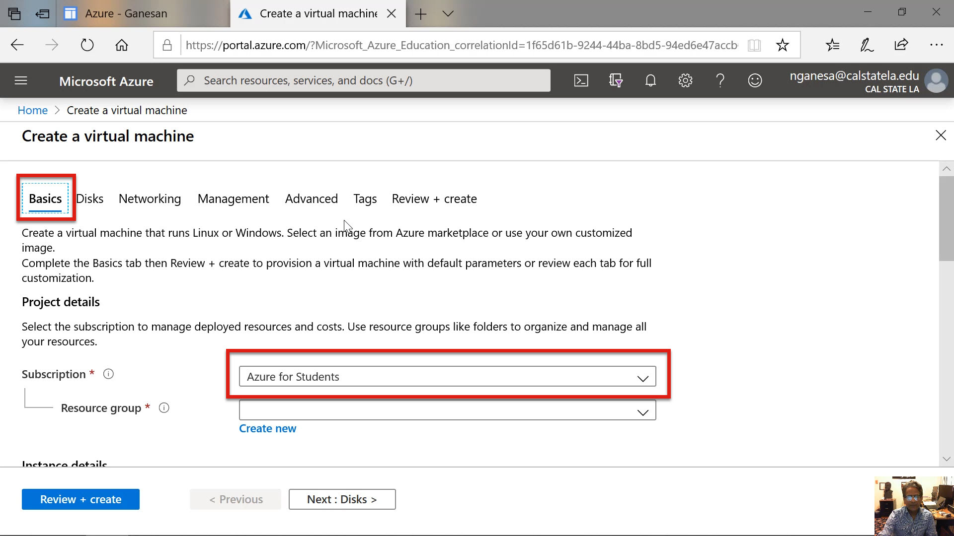 The diagram below shows the first selection to be made by choosing an appropriate type of subscription. In most cases, there will only be one subscription available in the drop-down menu that would be the Azure for Students subscription.