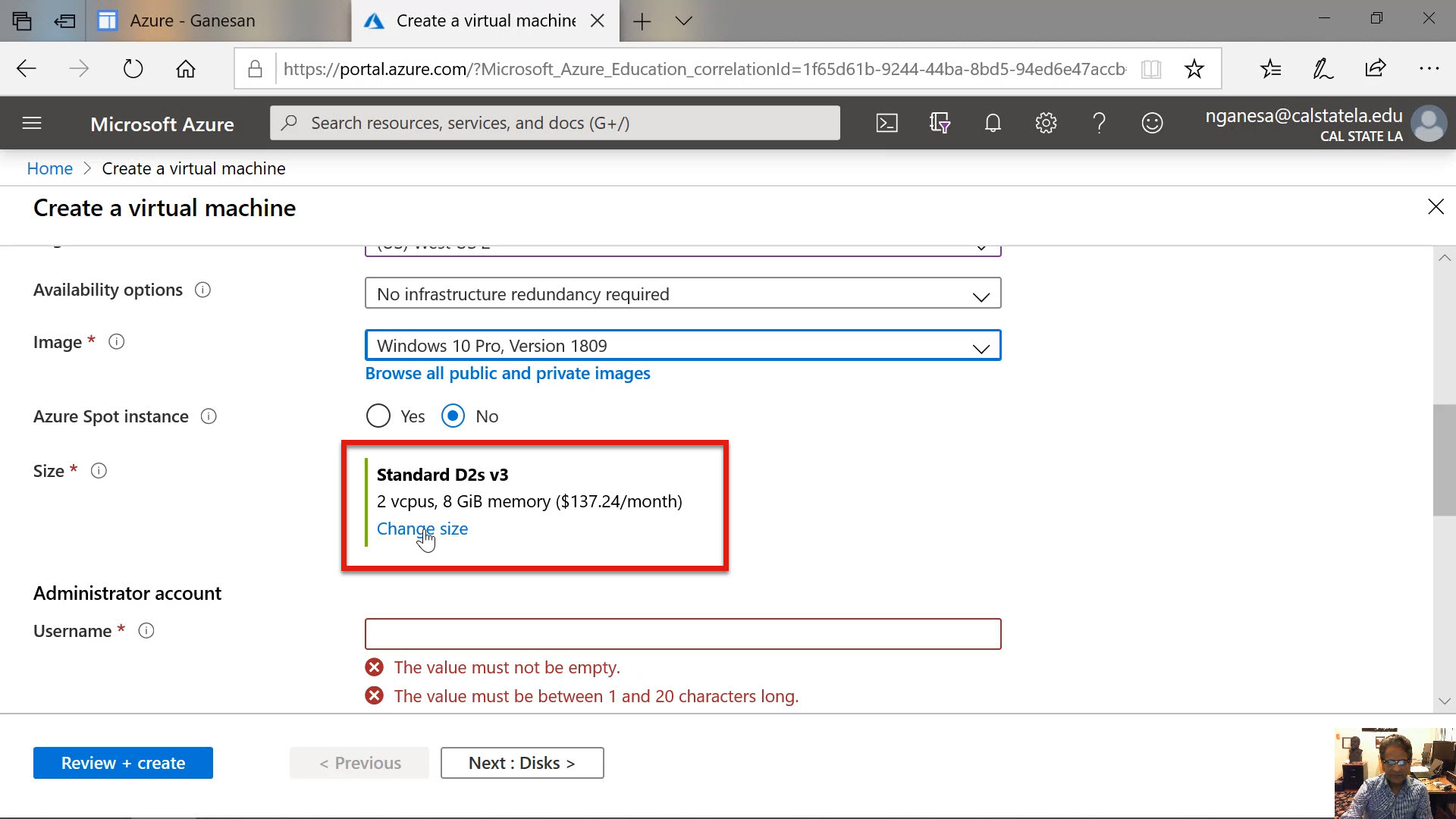 Azure refers to the processor/memory specification as the size of the Virtual Machine (VM). Depending on the size of the VM, the charges differ. More powerful machines are obviously more expensive. To change the VM size, click on the option below the processor description that says Change Size, as shown in the following diagram.