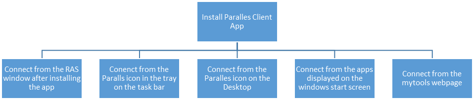 Diagram 1 summarizes the steps that are required to install the Parallels client, whereas Diagram 2 outlines the steps for connecting to the Parallels server in different ways.