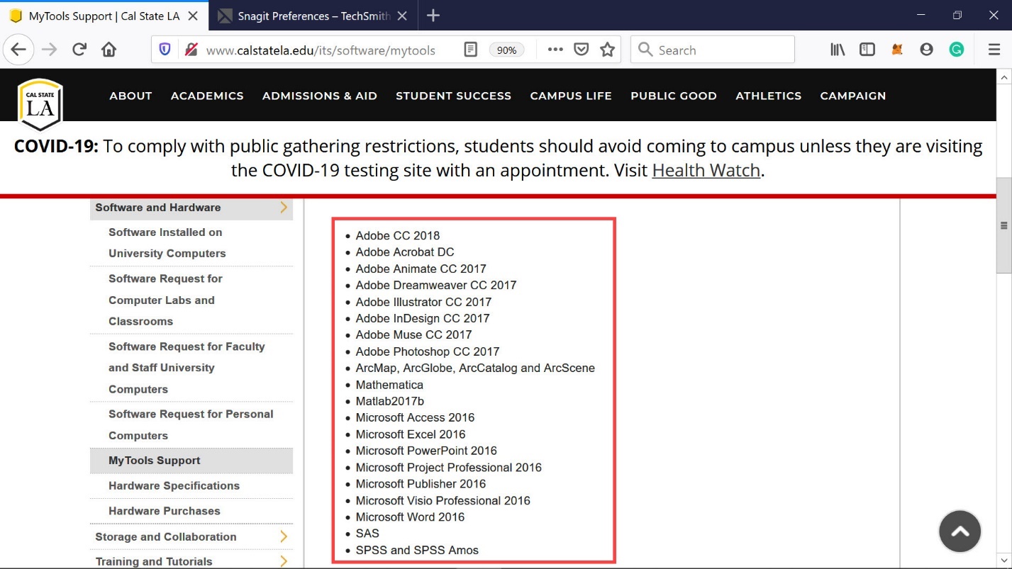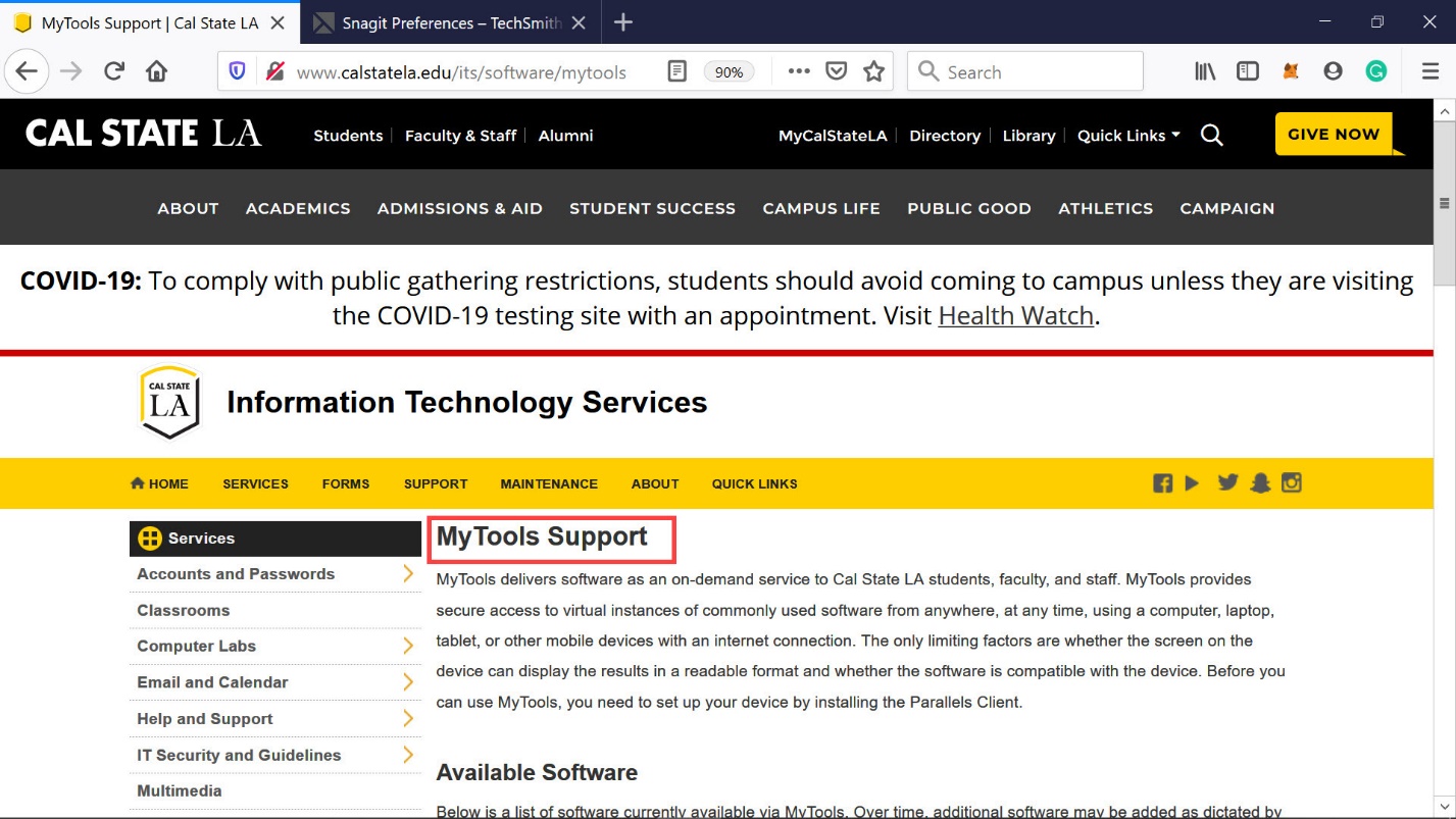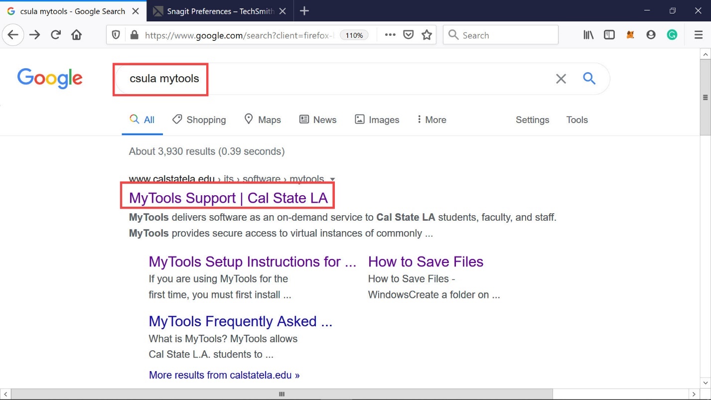 The website on Parallels hosted by the Information Technology Support division outlining the steps for the installation and use of the Parallels application server contains very useful information. To search for the link to the page, use the keywords CSULA and "mytools" in the Google search bar as shown in the next diagram. Click on the first item on the search results entitled MyTools Support I Cal State LA to access the support page.
