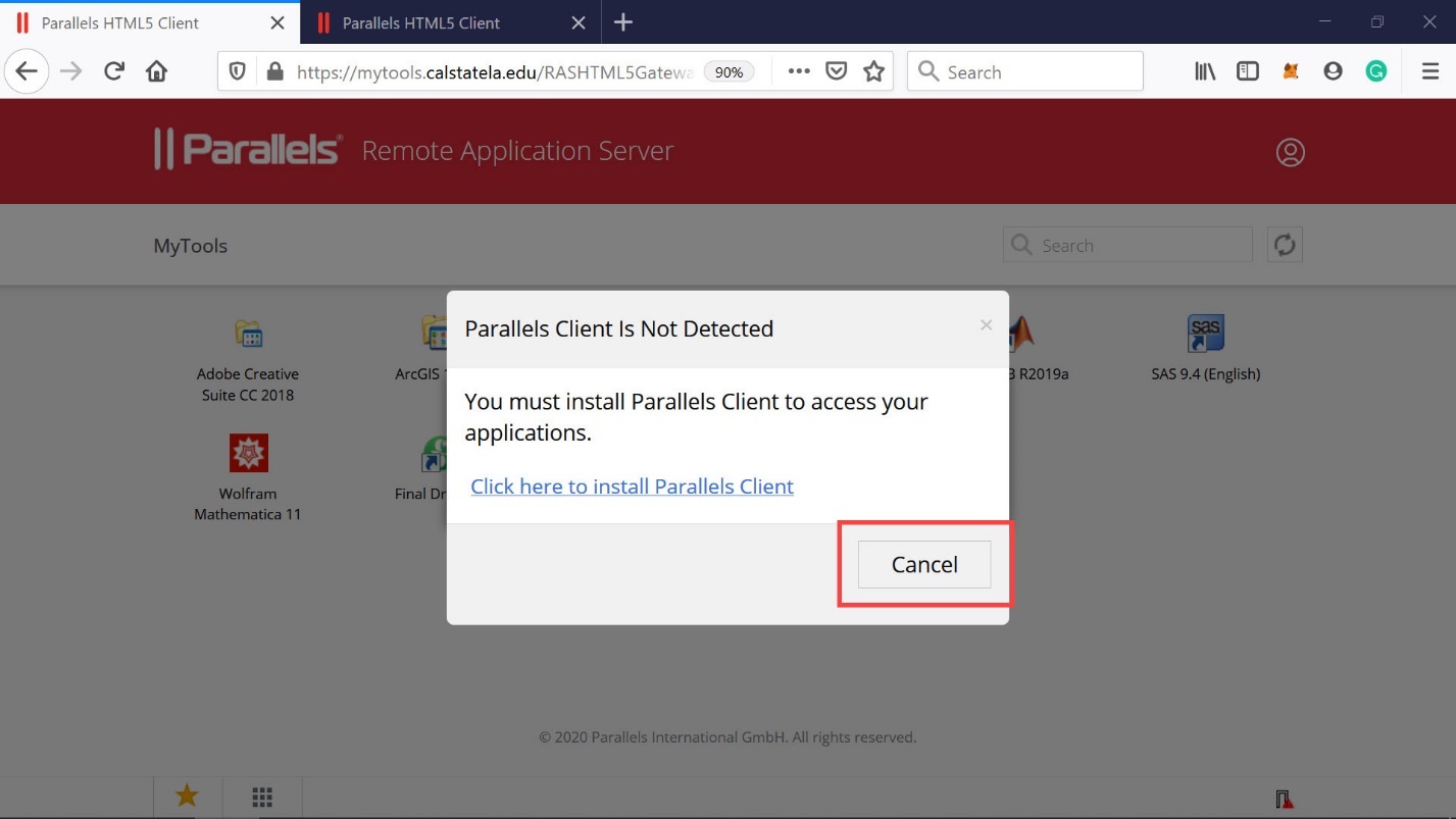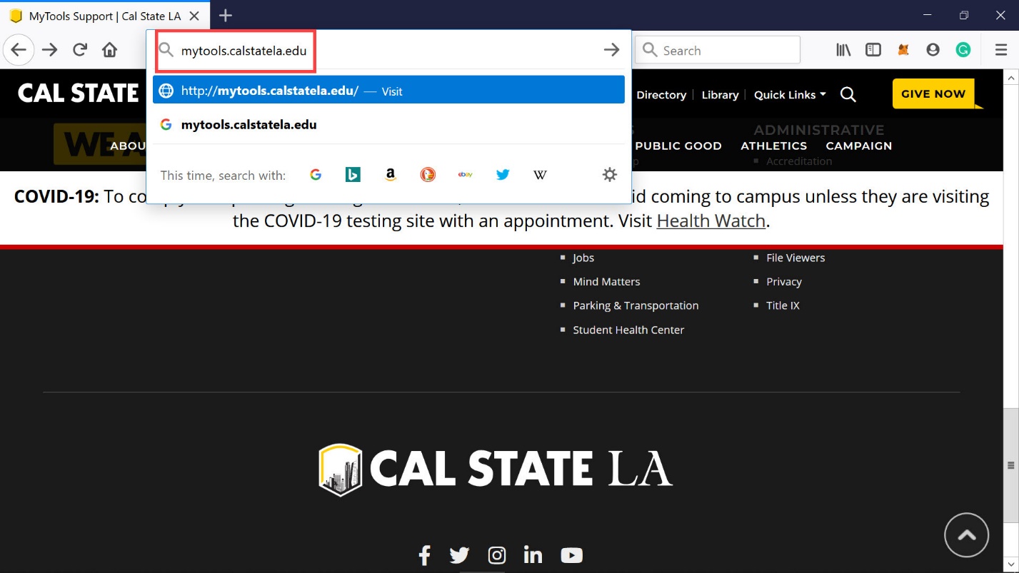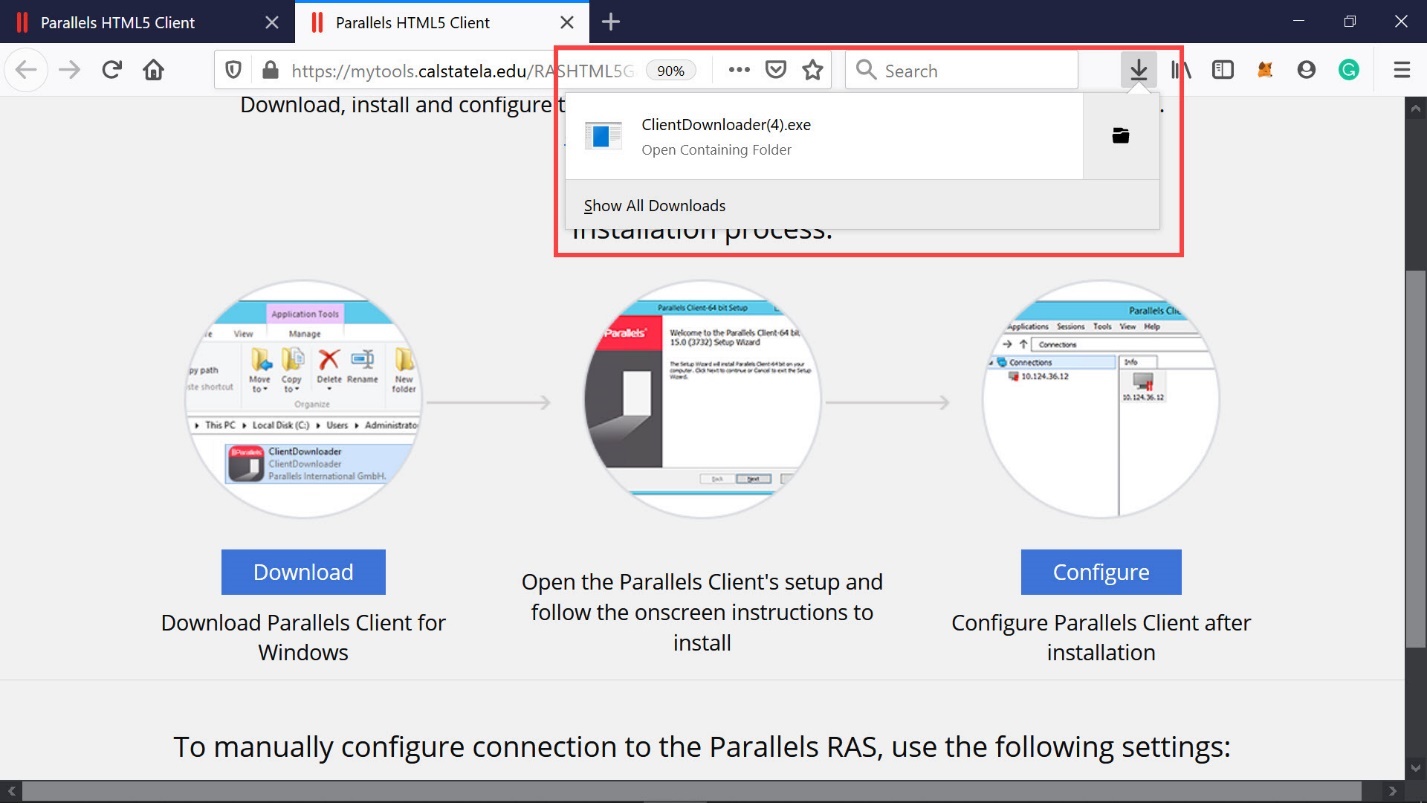 Reviewing some of the training material mentioned in the previous step would provide a better understanding of downloading and installing the Parallels client. In order to download the client, the “mytools” webpage must be accessed by typing the web address, mytools.calstatela.edu, on the browser as shown in the next diagram.