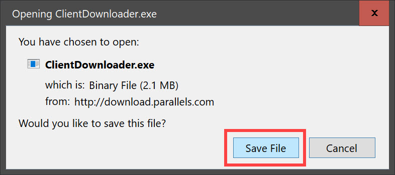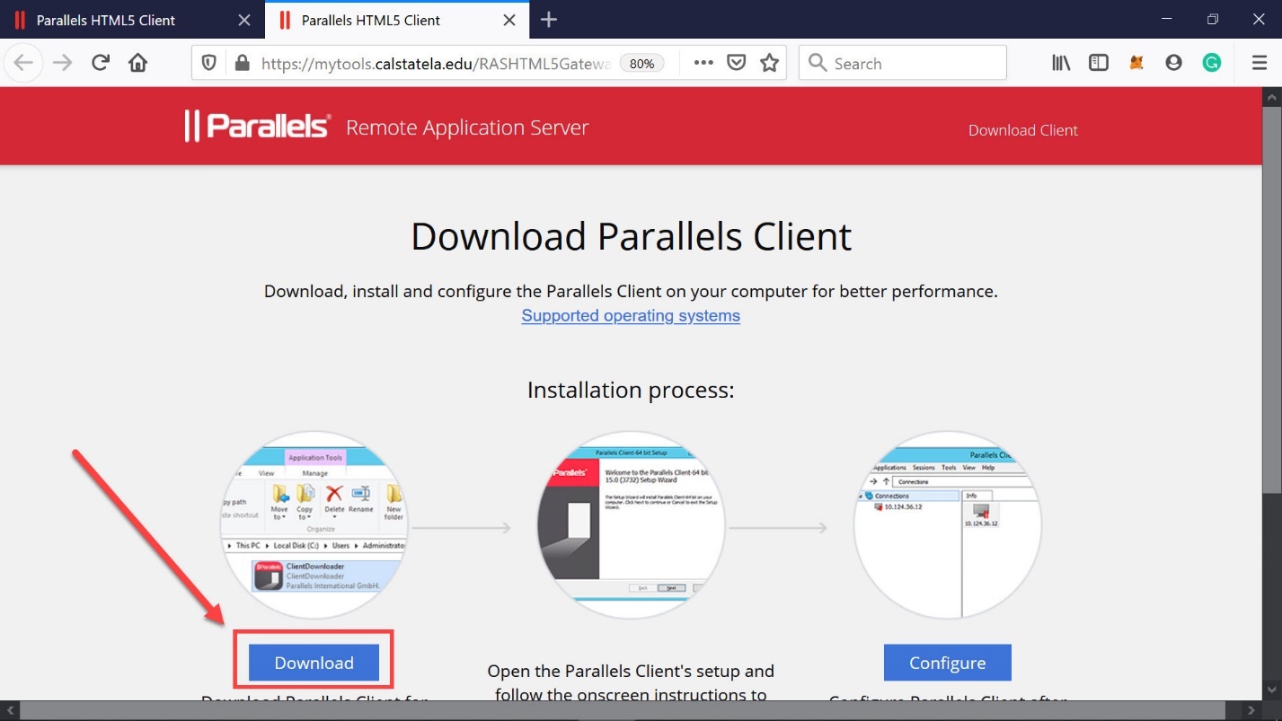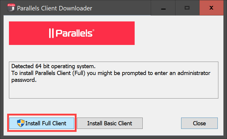 A new screen will now be as shown in the next diagram. Click on the download button to start the actual download process. In this case, the Parallels client will be downloaded for a Windows computer. In other words, the app that will be downloaded by clicking on the download button highlighted can only be installed on a windows computer. The procedure to download and install the Parallels client app for a Mac computer will be discussed later.