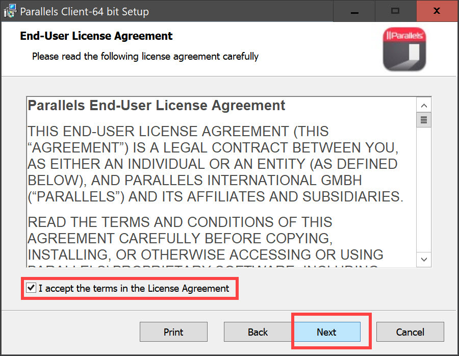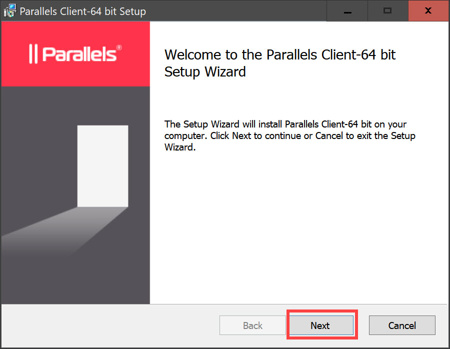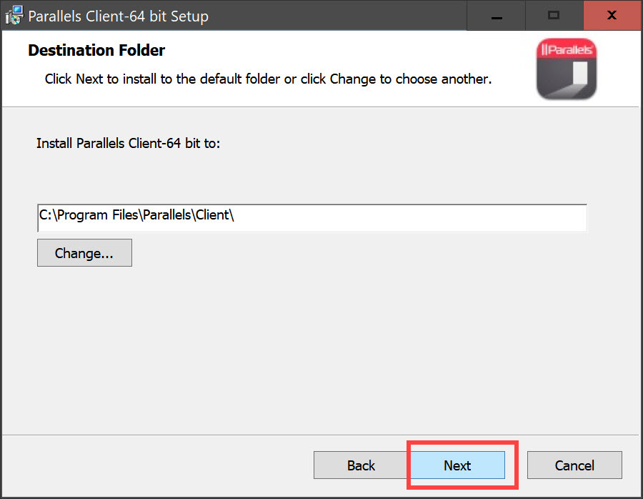The screen will now show the default installation folder for the Parallels client app. Click on the Next button.