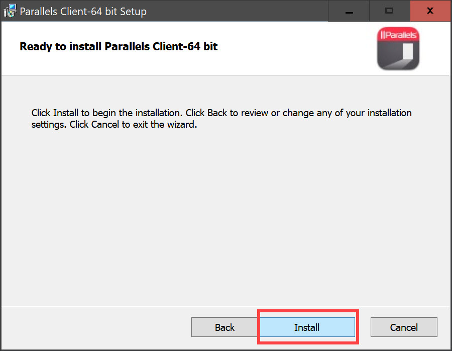 The computer is now ready to install the Parallels client, which incidentally is a 64-bit version of the app. Click the Install button shown in the next diagram to commence the actual installation process.