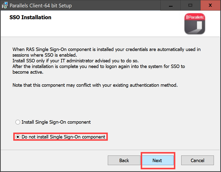 A screen for selecting, if appropriate, the single sign-on component will now be presented. For this example, select the “do not install single sign-on component” by clicking on the appropriate radio button. Click the Next button to proceed to the next step.