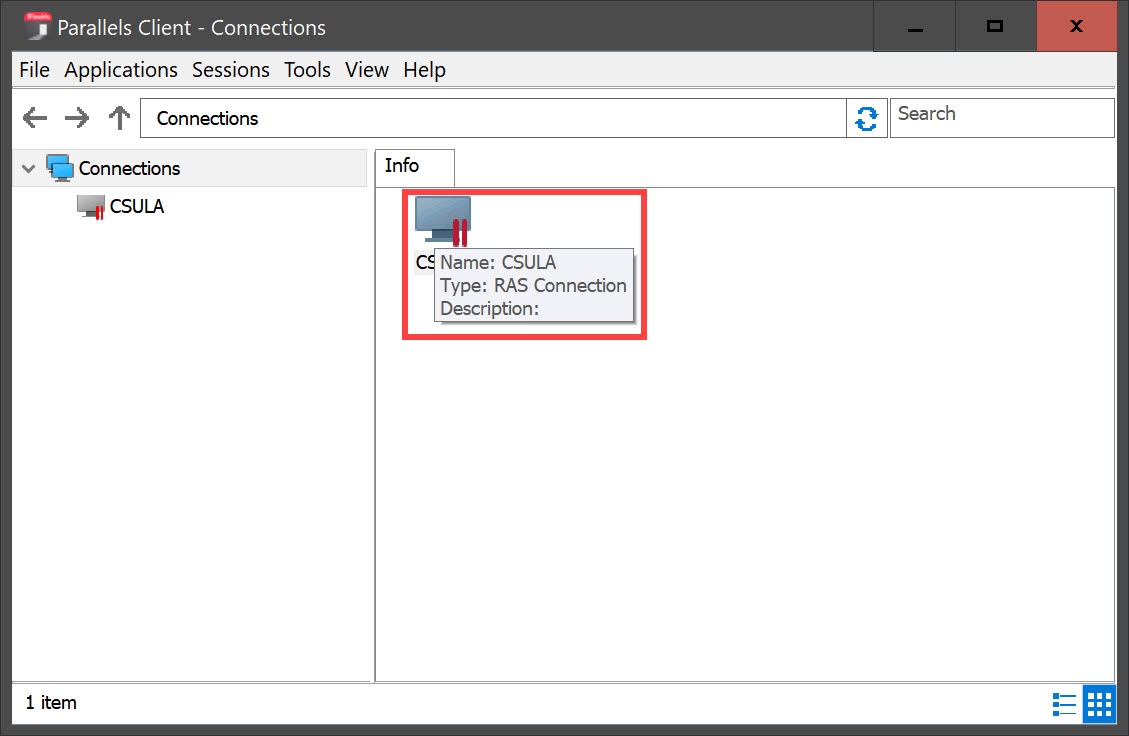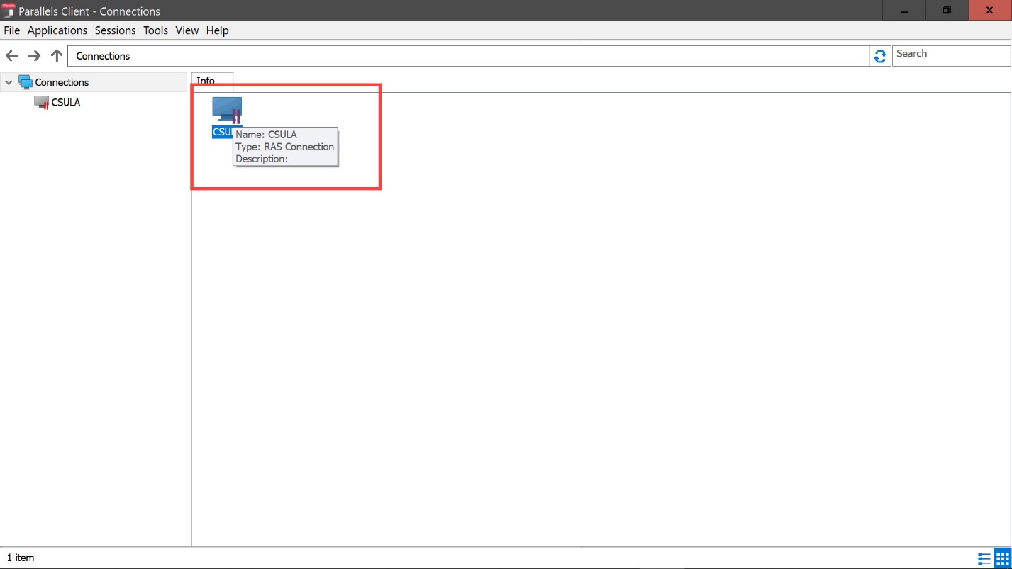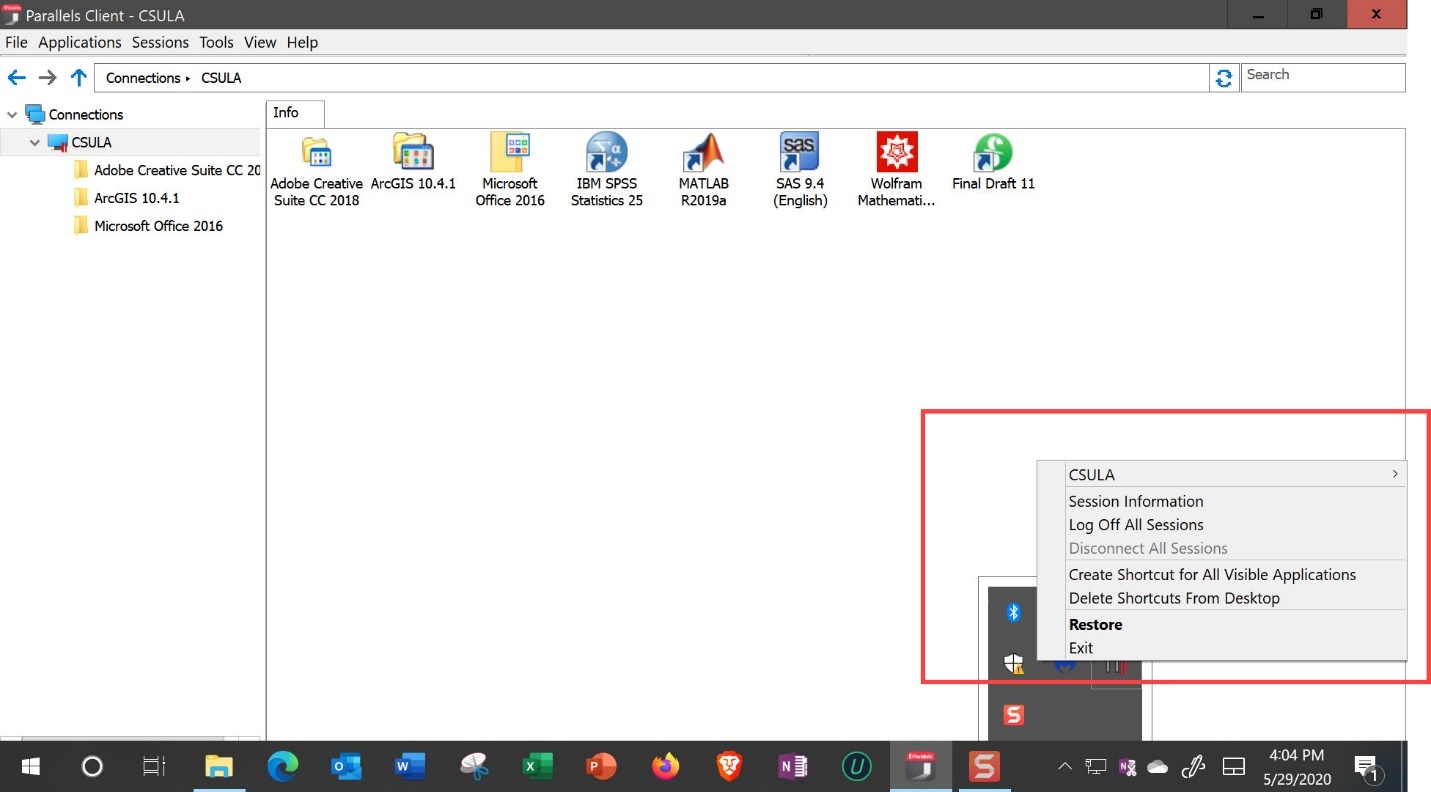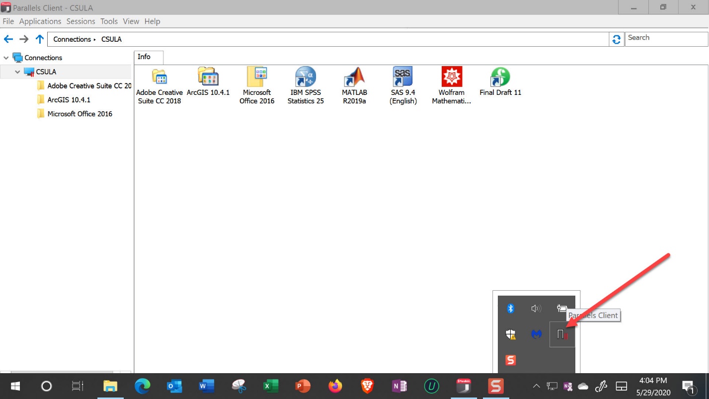 The CSULA icon displayed in the next screen will confirm that the Parallels client has been installed and a connection has been established to the CSULA Parallels remote access server as shown in the next diagram.