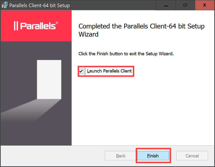 Once the installation is complete, the final screen pertaining to the installation process will appear as shown in the next diagram. Leave the selection labeled Launch Parallels Client checked and click on the Finish button to proceed to the next step.