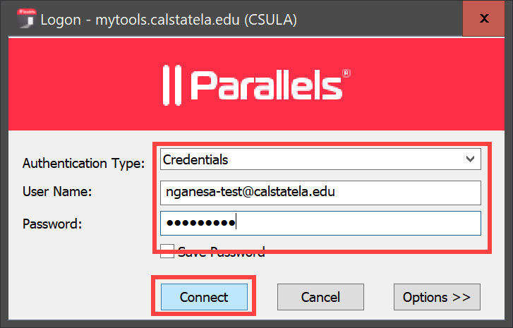 Now, enter the username and password provided by the University and click the button labeled Connect as shown in the following diagram to move to the next step.