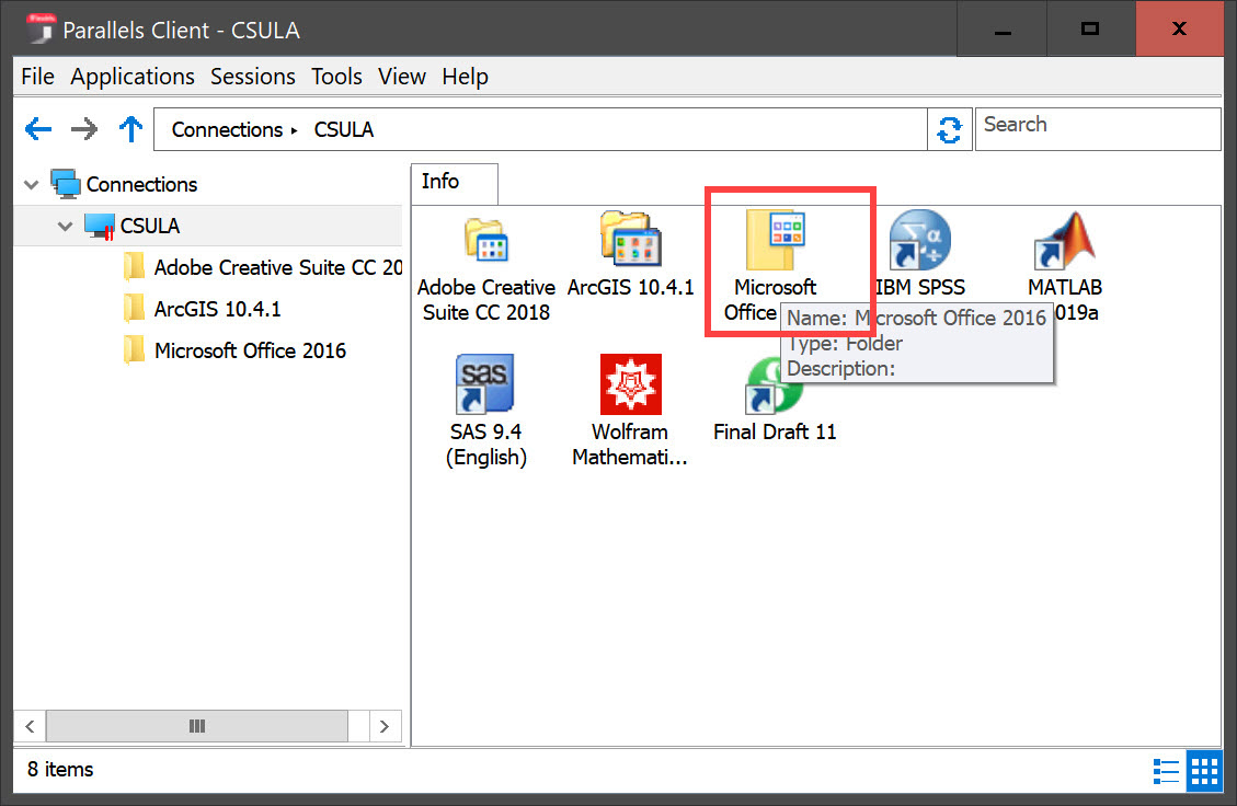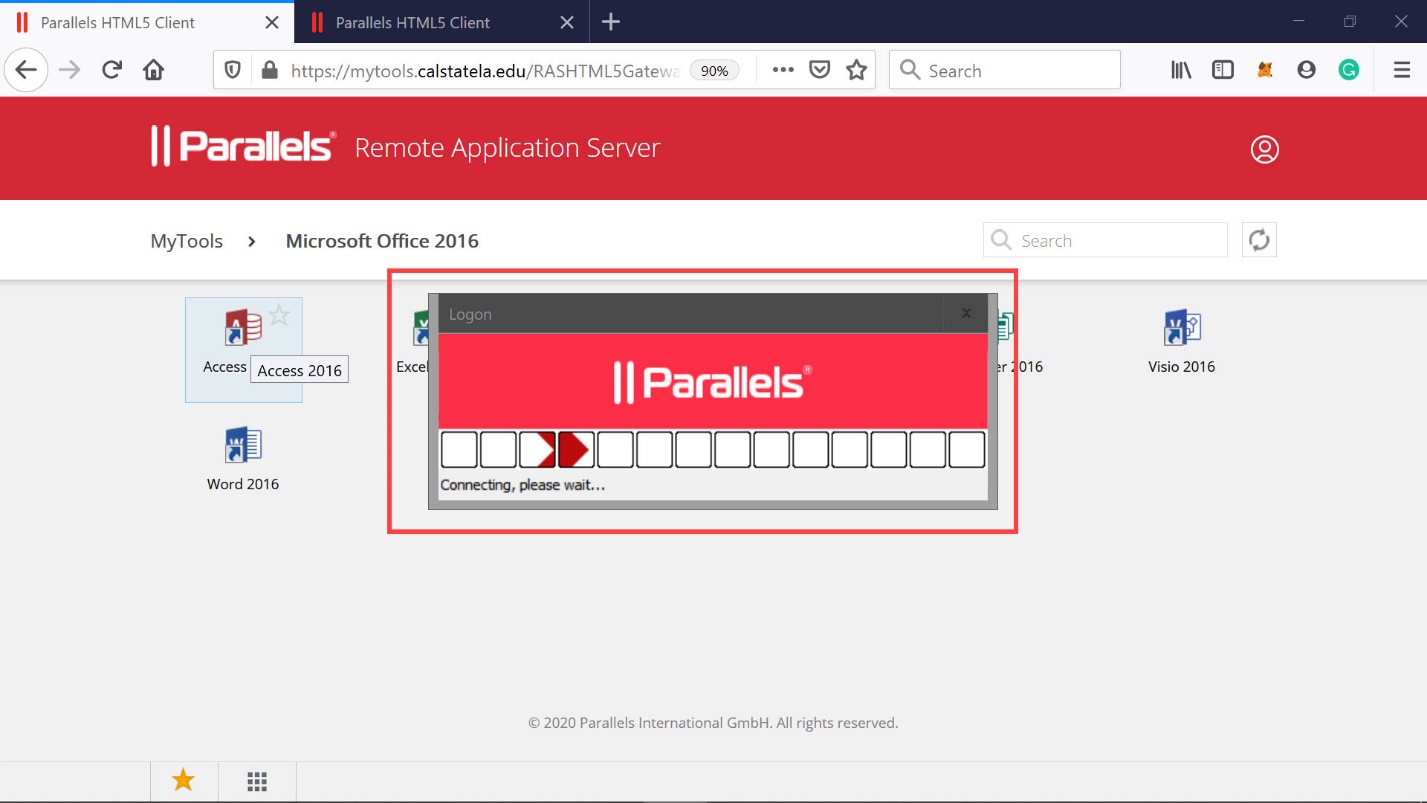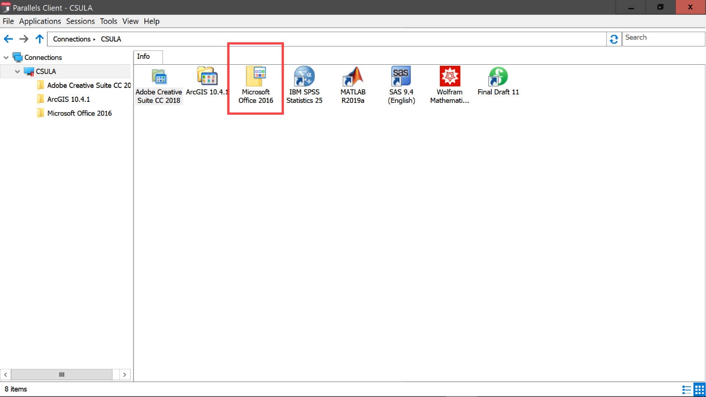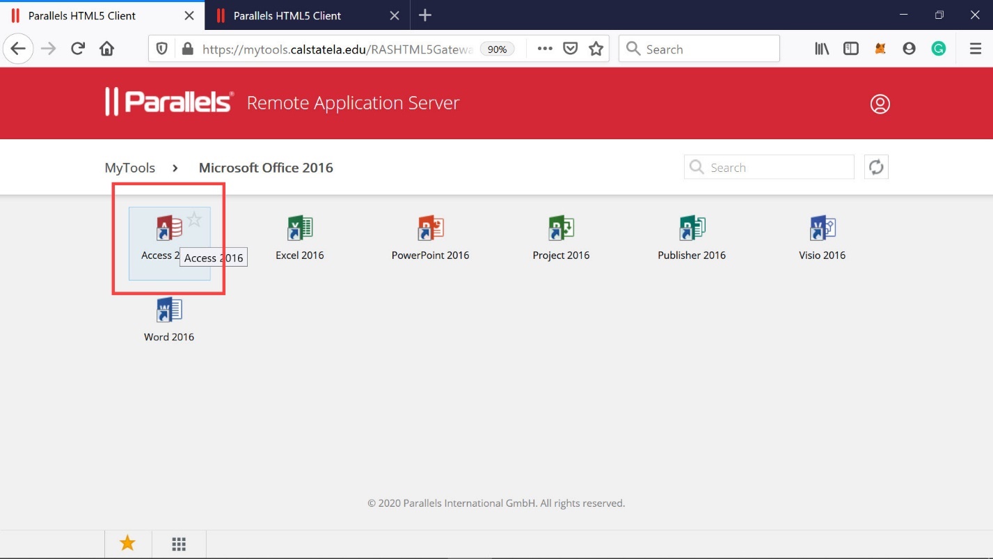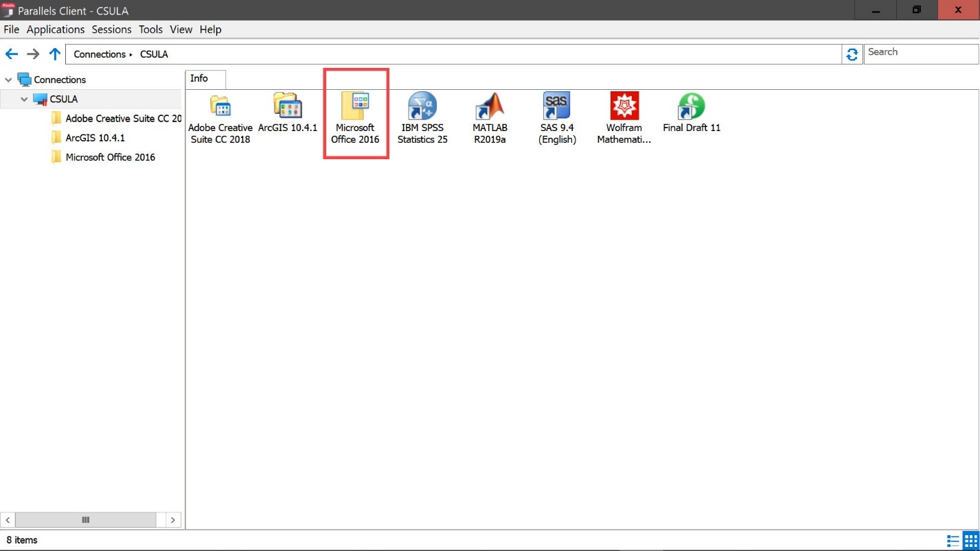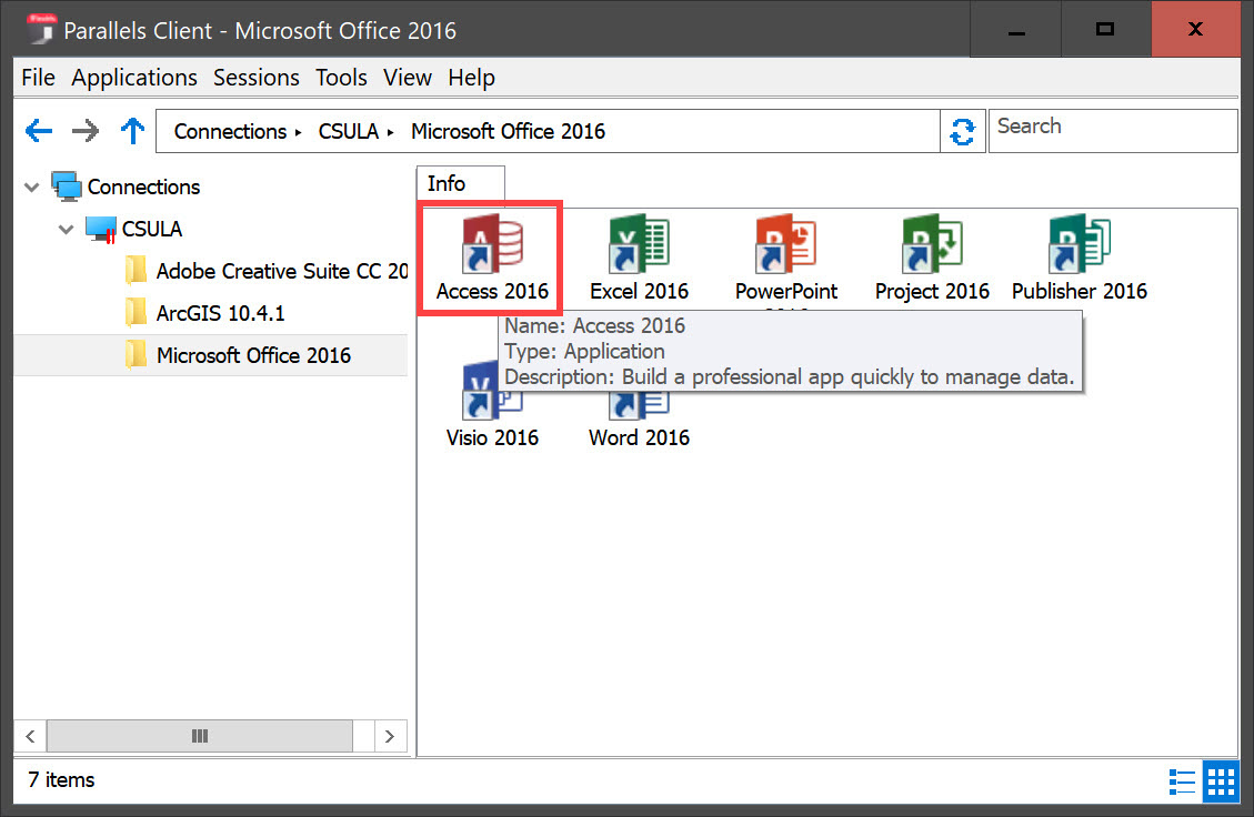 The purpose of the Parallels server is to host applications for employees of an enterprise to access them remotely. One or more applications can be hosted on the server. An example of an application that could be hosted on the server is Microsoft Access. The campus has set up an application server based on the Parallels platform supporting several specialized software. In order to access the application server, a parallels client must be installed on the computer from which the server is accessed. This can be a tablet, laptop, or desktop computer running different operating systems. There are different Parallels apps for different operating systems. For example, the Parallels app is available on the Windows Store for the Windows computers and on the Apple store for Apple computers. The ITS web page provides links to apps on the respective stores and links to directly download the Parallel apps for different operating systems.