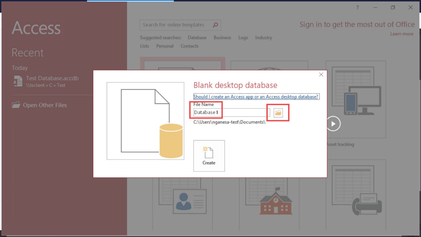 The initial database creation window will appear again, displaying the database name and the correct folder name on the local computer to store the database. Now, click the Create button highlighted in the next diagram to start using the Access program.