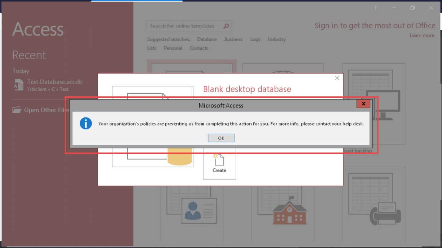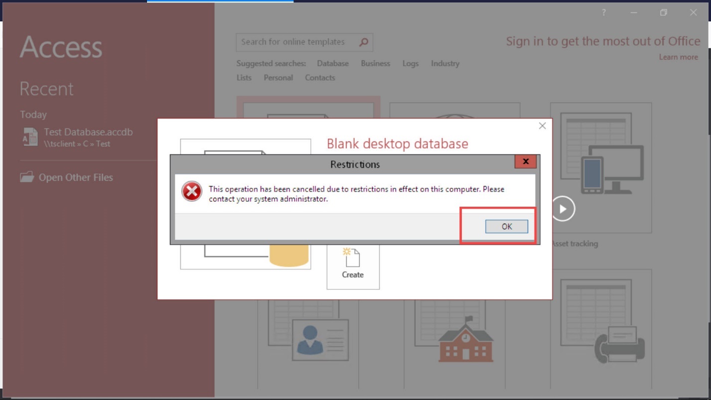 There might be instances where clicking on the Create button may result in an error message being displayed as shown in the next diagram. Ignore this message by clicking on the button labeled OK. Afterwards, follow the steps described earlier to specify the name of the database file and the location of the local folder where the database file should be stored.