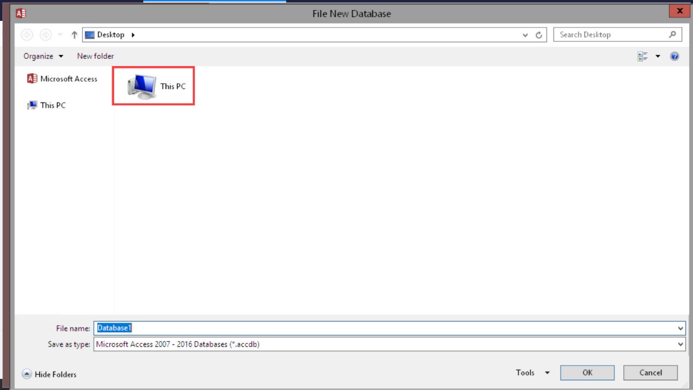 The Windows Explorer screen for storing a file will now be displayed as shown in the next diagram. In this diagram, the icon labeled This PC represents the local computer and not the application server. Double-click on this icon to display the locations on the local computer where the database file could possibly be stored.