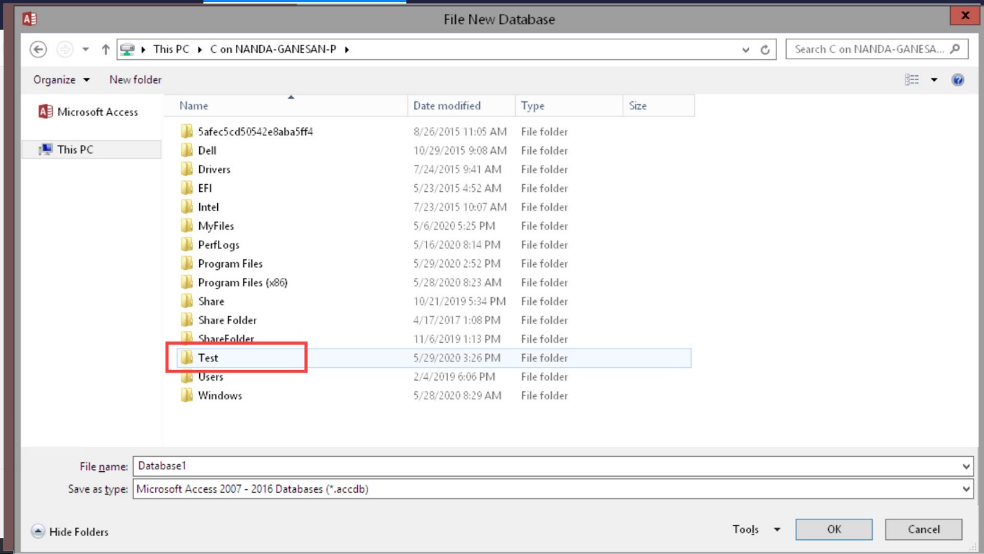 Click on the C drive icon shown in the above diagram to display the contents of the C drive as shown in the next diagram. In this example, the database file will be stored in the Test Folder. Open the folder by clicking on the folder icon displayed and highlighted in the diagram.