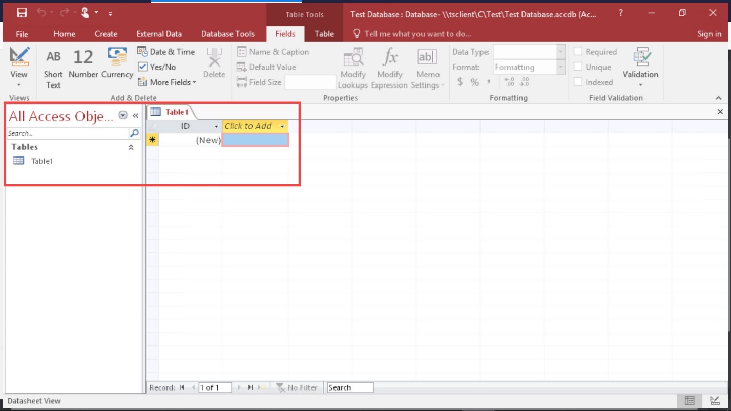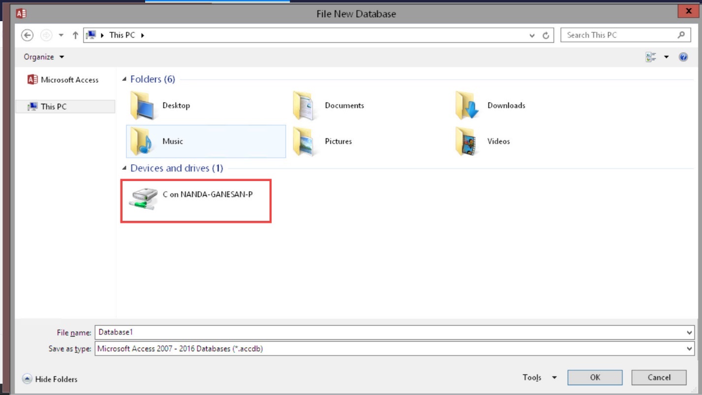 The Access database management system will now open as shown in the next diagram. Now, a name for the access database to be created and a location to store the database file need to be specified. At this time, attention must be paid to selecting an appropriate folder on the local computer to store the database file. If a local folder is not available to store the database, a new folder needs to be created. It must be borne in mind that the database cannot be stored on the remote access server because the user does not have the privilege to store any files on the remote access server. Therefore, the database file that will be created while using the Access software needs to be stored on the user’s local computer.