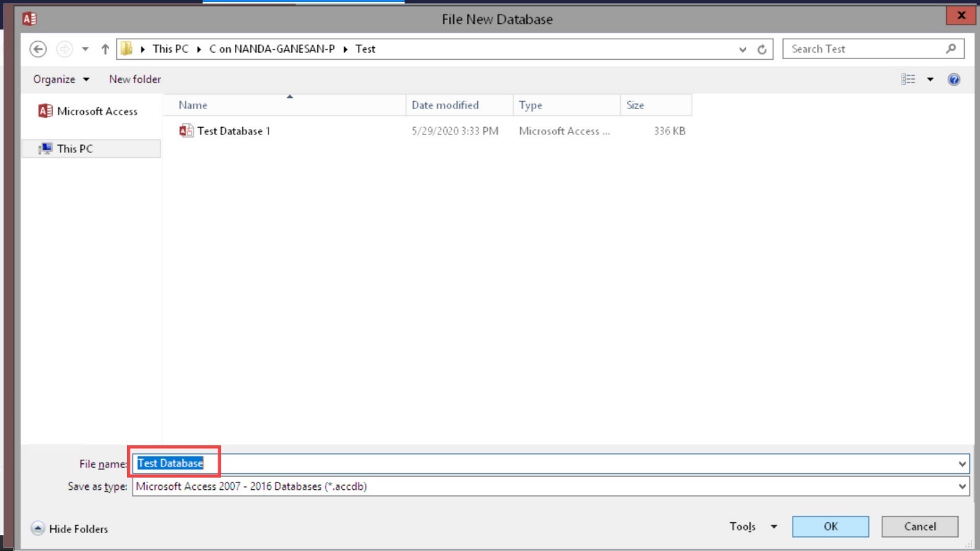 Now, provide a name for the database file and click on the button labeled OK shown in the next diagram to move to the next step.