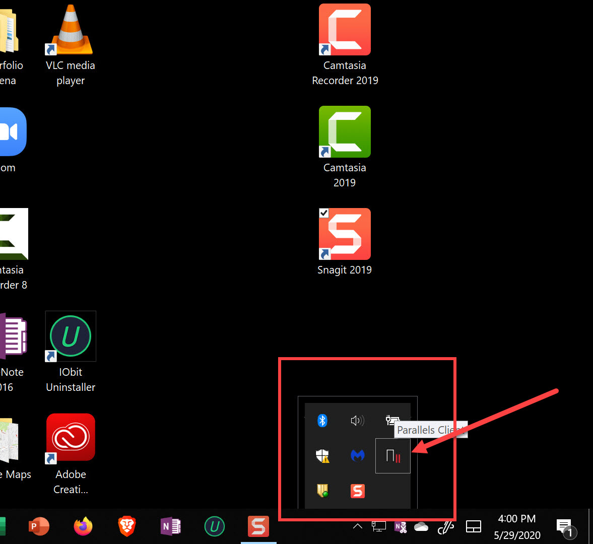 A handful of details on troubleshooting and managing the Parallels client will now be presented. After using and closing an application on the Parallel application server, the Parallels client may still be running on the local computer unless it has been stopped explicitly. In order to check whether the Parallels app is still running, the task tray icons need to be visually examined as shown in the next diagram. The diagram shows that the icon depicting the Parallels client is visible in the tray. If the icon visible in the task tray, then it is an indication that the Parallels app is running in the background.