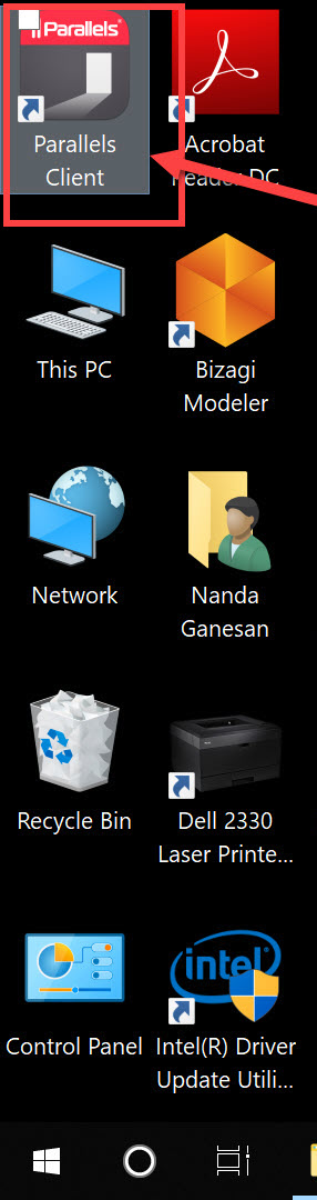 Also, it is important to note that after stopping the Parallels apps, it needs to be started whenever it is to be used the next time. This can be done in two different ways. One is to launch the app by clicking on the Parallels shortcut displayed on the Desktop as shown in the next diagram.
