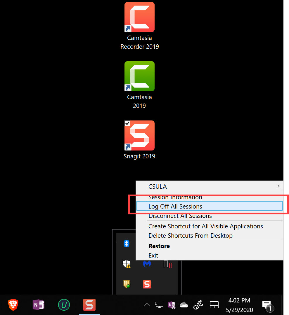 In order to avoid any confusion or conflict while using the Parallels app, the best practice would be to log off from all sessions after using a software application on the remote access server. It can be achieved by clicking on the Log Off All Sessions entry on the popup menu as shown in the next diagram. It is important to note that although the user is logged off from all sessions, the Parallels client may still be running in the background.
