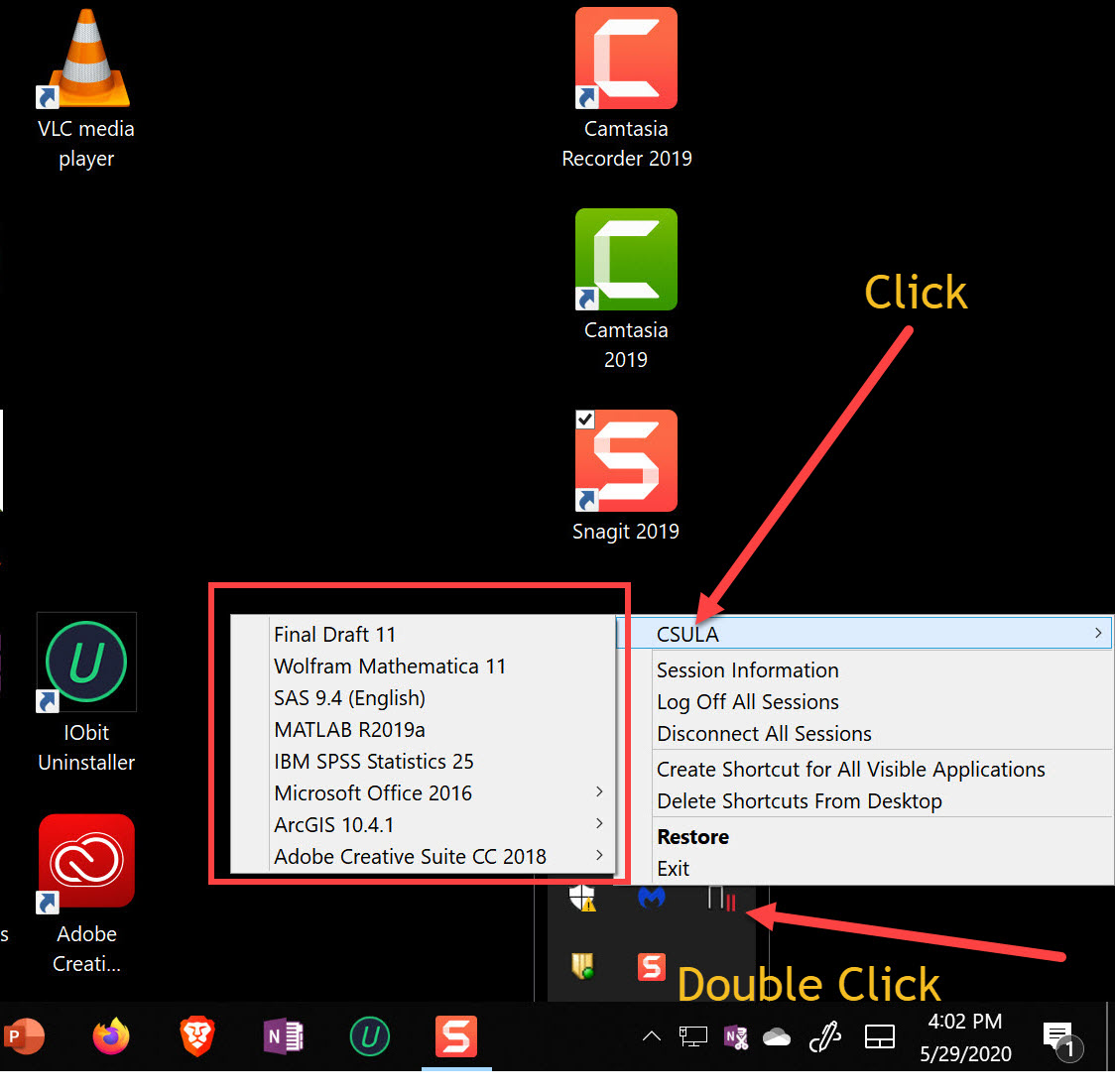 Clicking on any one of the icons will open the applications supported under the group of applications represented by the icon. On the other hand, right-clicking the Parallels icon in the tray will result in the display of a popup menu from which the applications could be accessed. This is another way to open the applications on the remote access server. From the popup menu shown in the following diagram, click on the entry CSULA to display the applications that are supported on the remote access server. It would now be possible to select one group of applications and then select one application from that group to be launched. This is yet another way of starting an application, such as for example, Microsoft Access.
